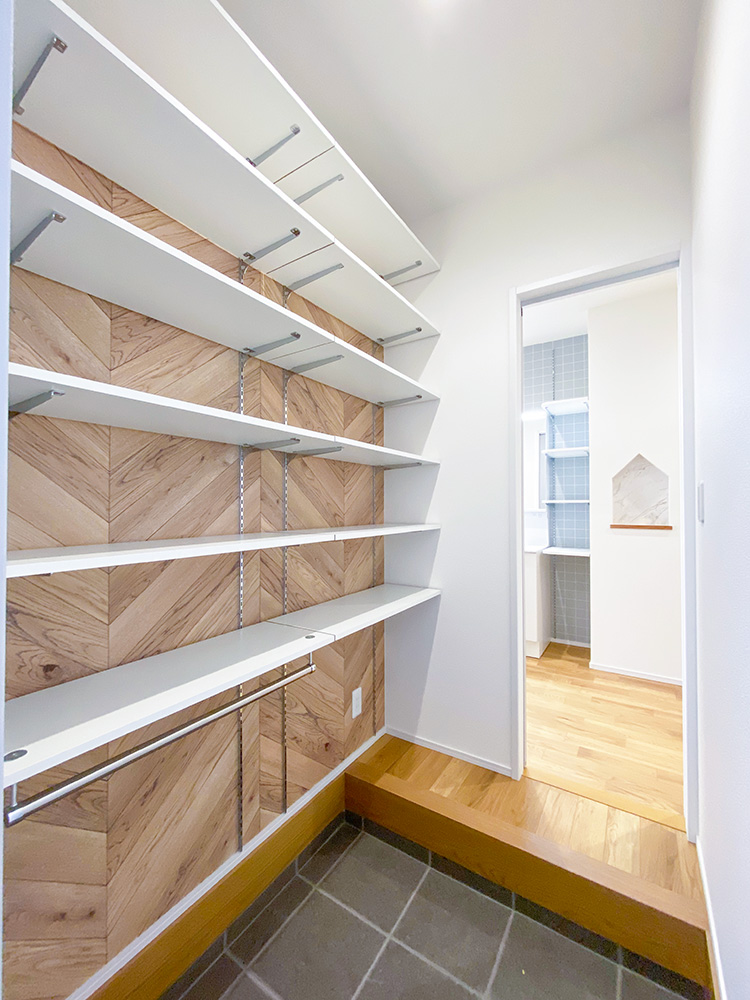 - キッチン、パントリー、ランドリーと横並びに設けました。料理の合間にお風呂掃除や洗濯などがスムーズにできるように家事動線を意識しています。