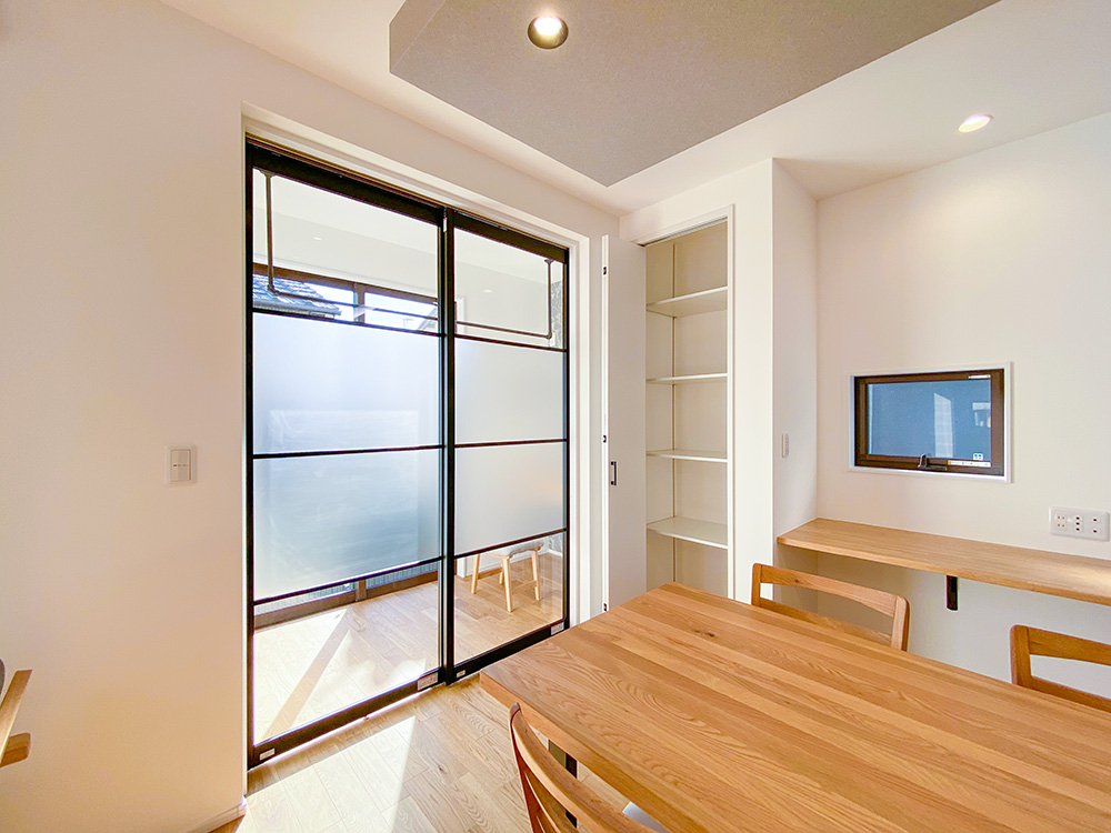 - 開放感のあるダイニングスペース。グレーの折り下げ天井で空間にアクセントをつけました。
