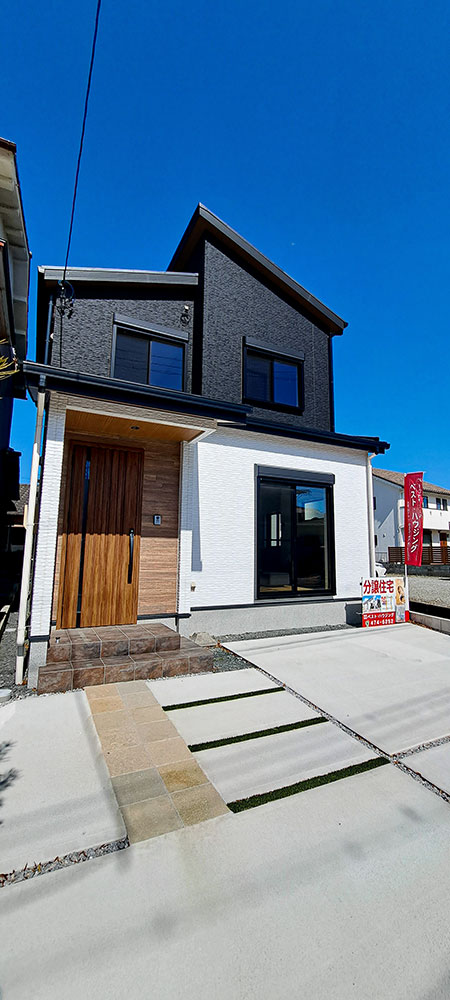 - ホワイト×ブラックの上下貼り分けした外壁に木目調のアクセントを配置したシックなデザイン