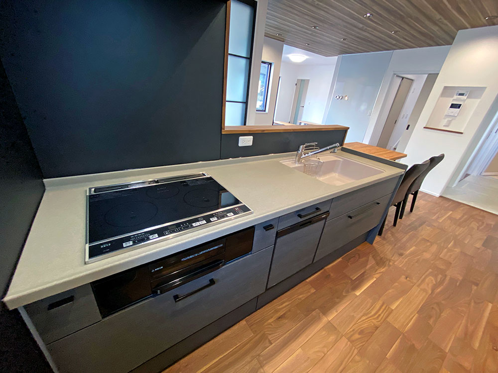 - おしゃれなブラックのキッチンを採用しました。対面キッチンで家族の様子を常に見ることができます。
