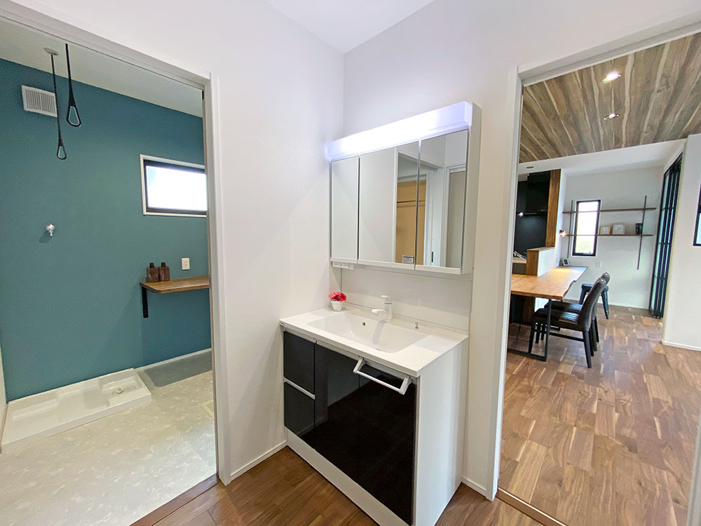 - ブルーグリーンのアクセントクロスを採用した清潔感のあるランドリーです。