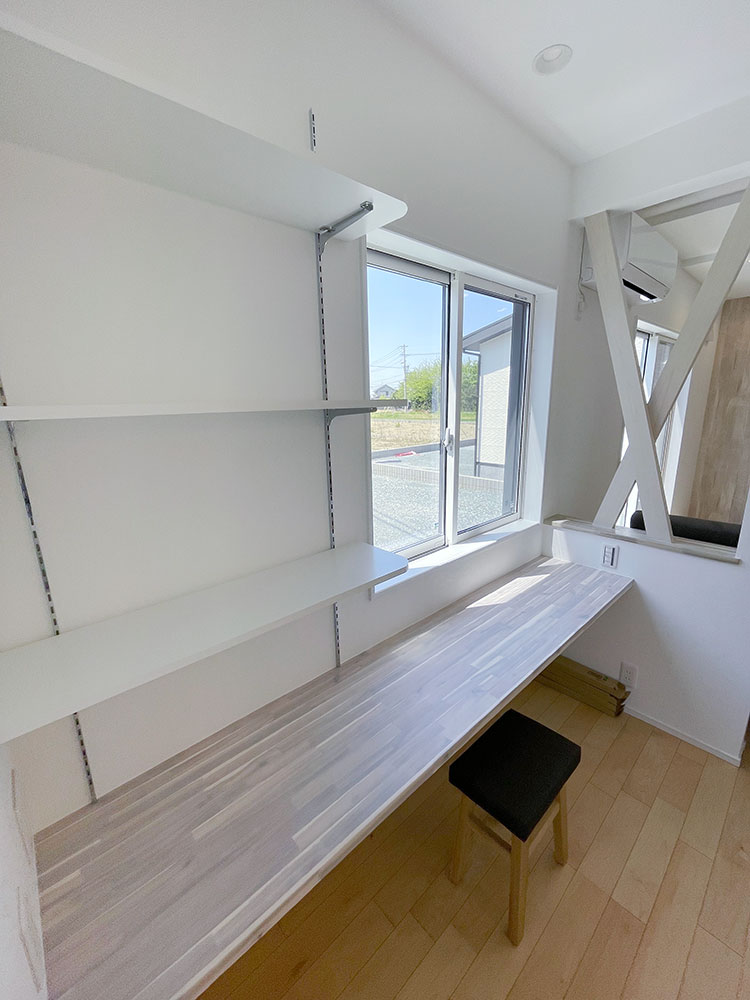 - 開放感の中でも必要なものはサッと手に届く機能性デスクをつくりました。
