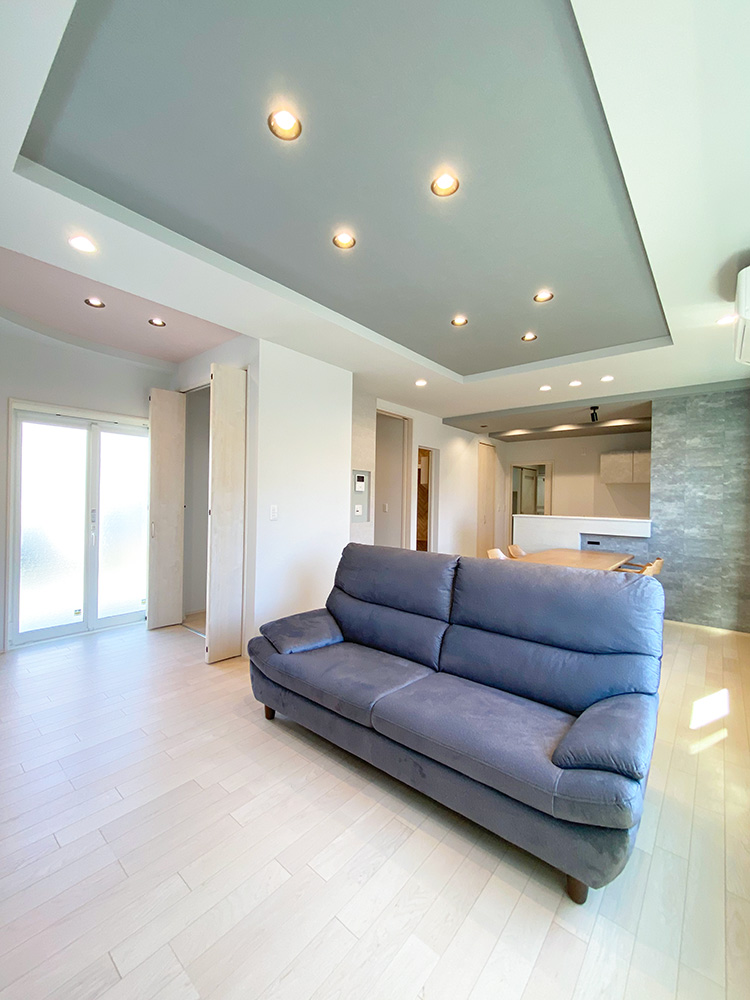 天井の傾斜が生み出す立体感と折り上げ天井×化粧梁×間接照明が描く、奥行きとぬくもりのあるリビングが魅力の住まい。