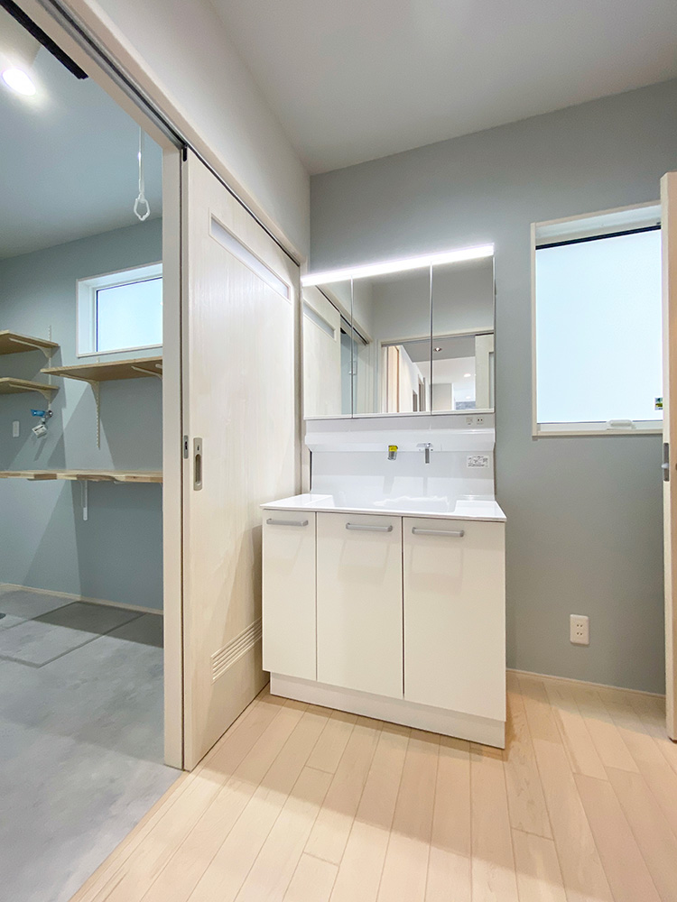 洗面化粧台を脱衣場から独立して作られたスタイリングエリアを配置しました。