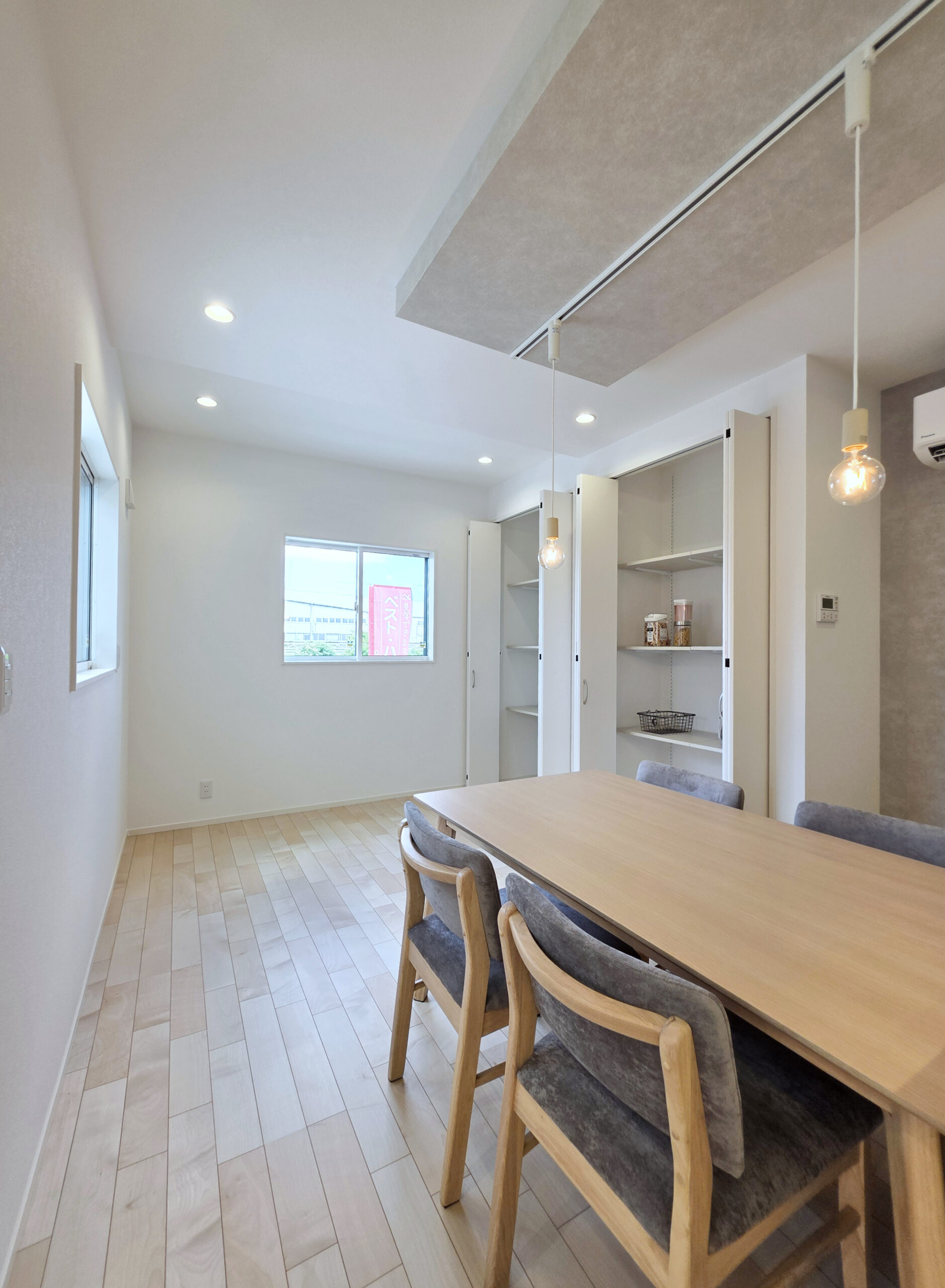 天井のデザインクロスとペンダントライトが、空間にアクセントと温かみをプラスしています。