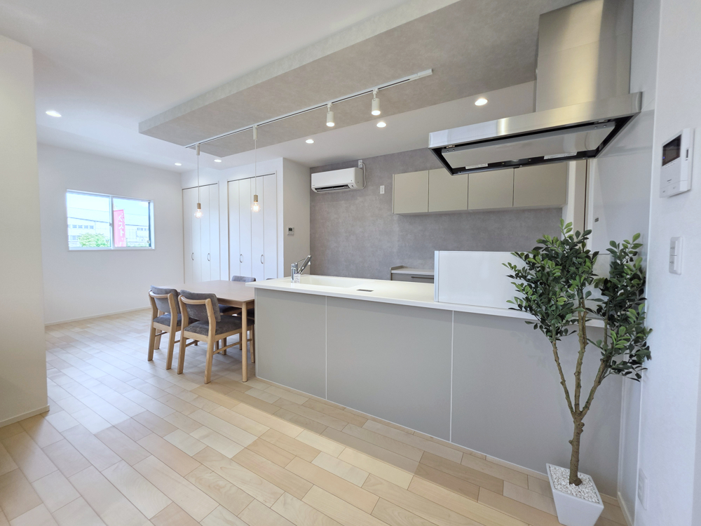 カスタヌック間接照明横並び配膳キッチンダイニンググレー手洗い動線帰宅動線回遊動線浜松市一戸建て建築実例