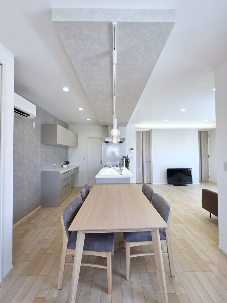キッチンダイニングの上部を折下天井にすることで空間にアクセントをプラスしました。