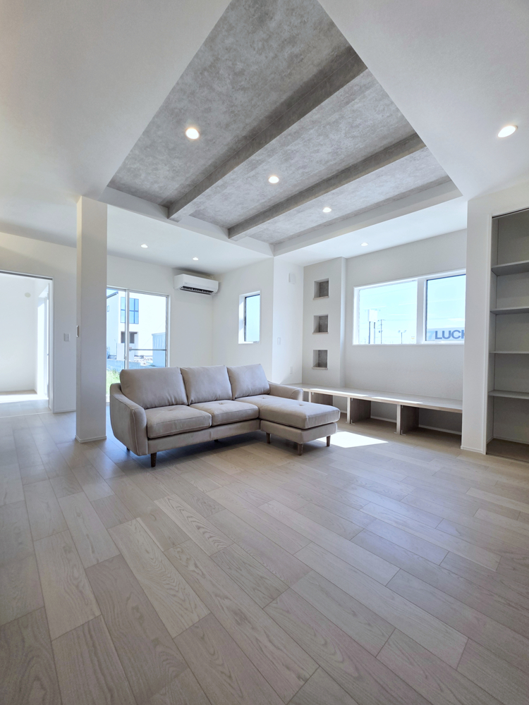 グレージュグレーカスタヌックリビング21帖ウィンドウベンチ間接照明平屋風間取りランドリーファミリークローゼット浜松市一戸建て建築実例