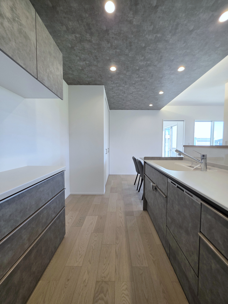 グレートーンでまとめたキッチンには、冷凍庫も置ける今どきスペース。