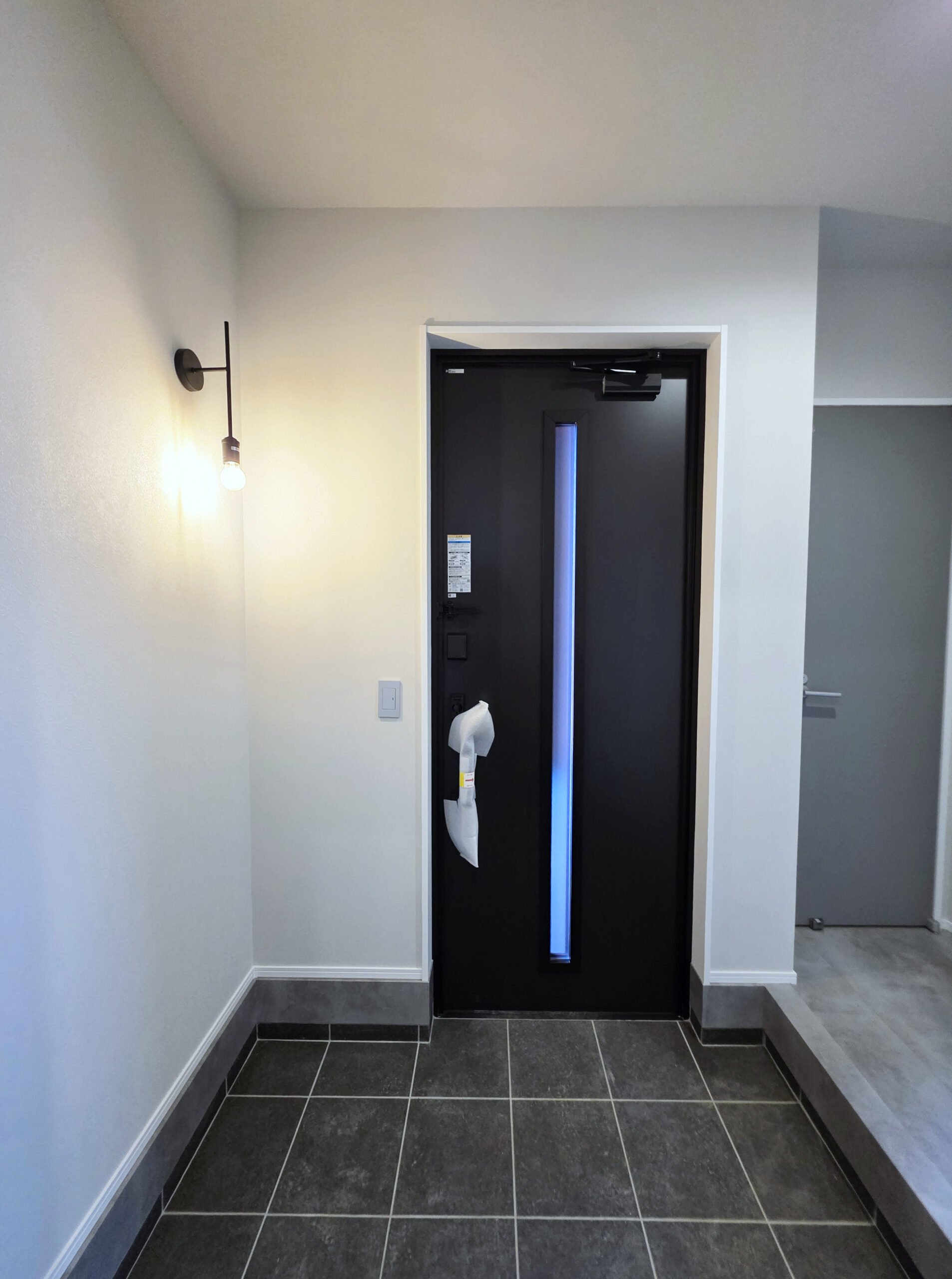 グレーを基調とした落ちつた雰囲気のエントランスに、オレンジ色のペンダントライトが優しく空間を包んでくれます。