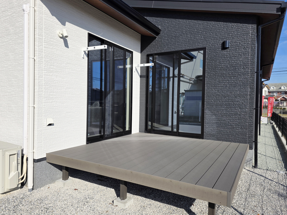 日当たりの良いウッドデッキはそのまま庭につながる設計で、