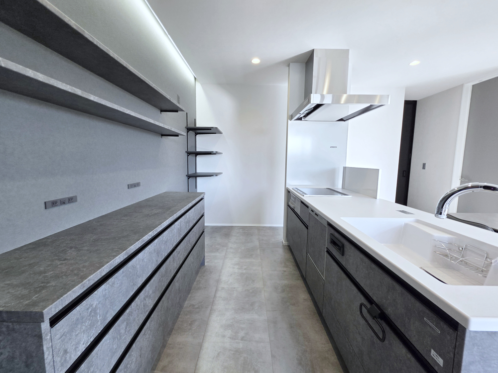 デザイン性だけでなくタッチレス水栓や薄型レンジフードなどを完備し機能性も充実しています。