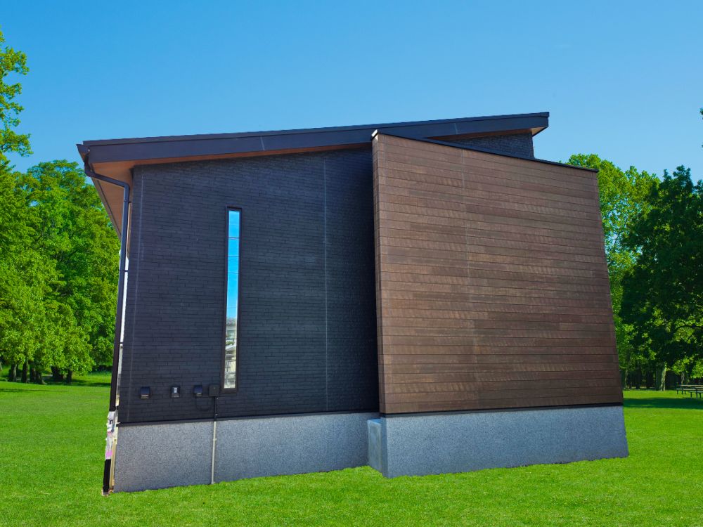 黒の片流れ屋根に、木目のアクセントウォールが映える外観。