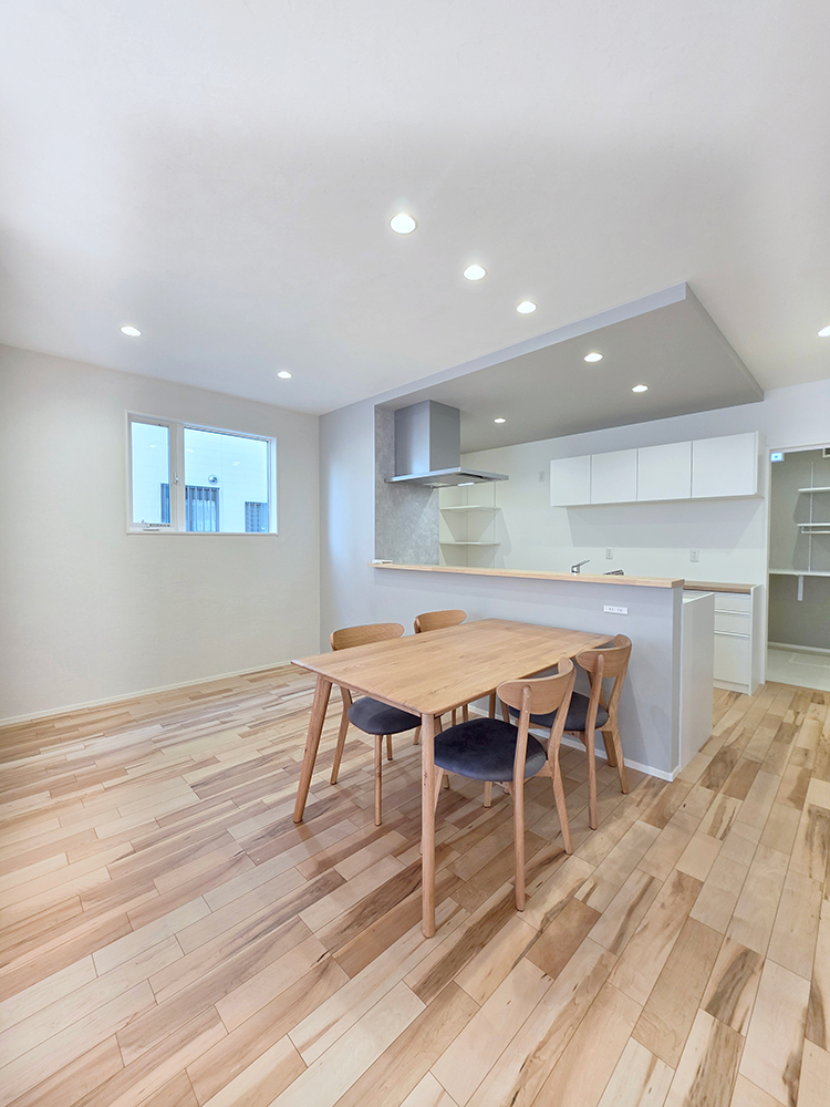 やさしい色合いで統一されたダイニングは、キッチン前に配置したことで配膳や片付けもスムーズに行えます。
