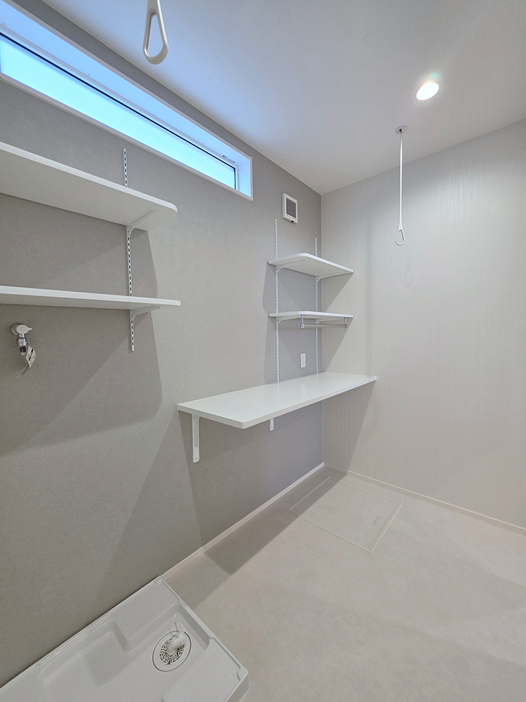 グレーで統一されたランドリールームは、可動棚や作業台、物干しパイプを吊り下げられるなど、使い勝手の良さを重視した造りです♪