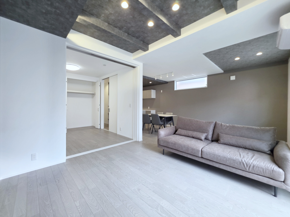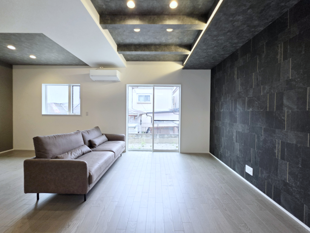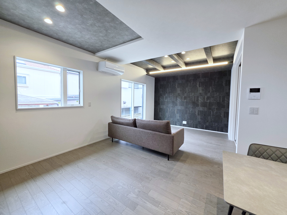 化粧梁と間接照明が印象的なリビング空間。グレー系のアクセントクロスが落ち着いた雰囲気をつくり出します。ソファを置いても十分な広さがあり、ゆとりある暮らしが叶います。