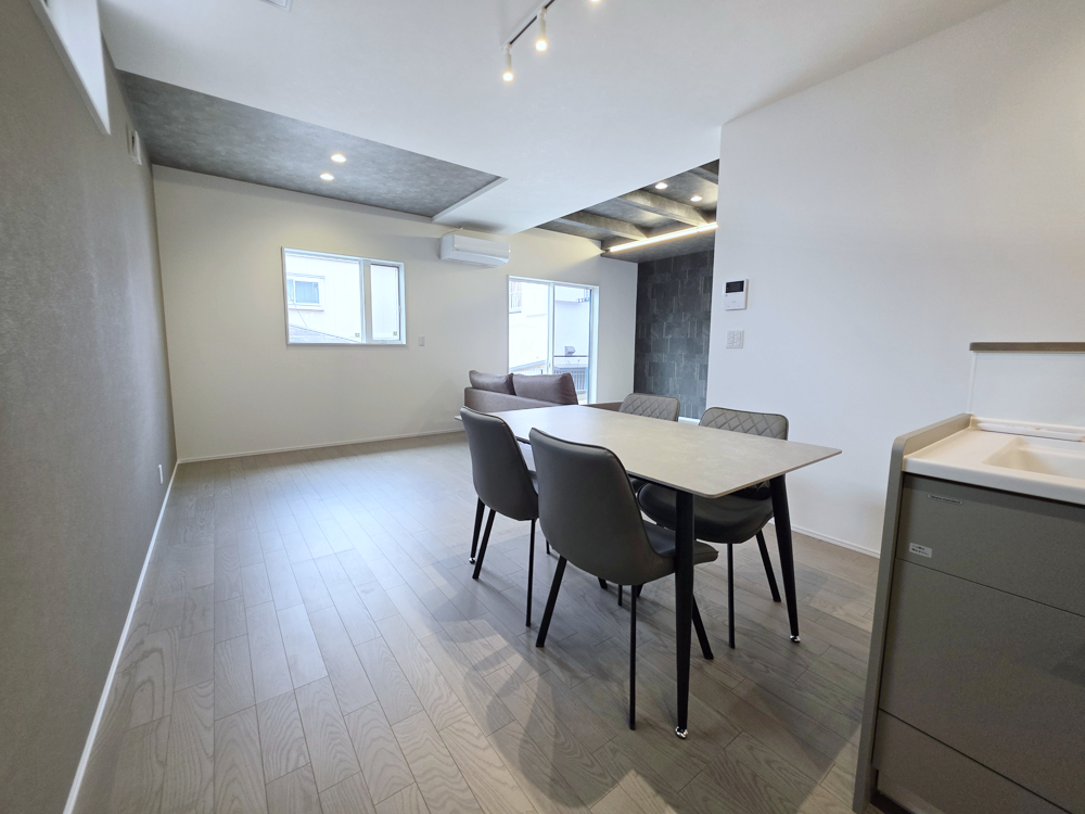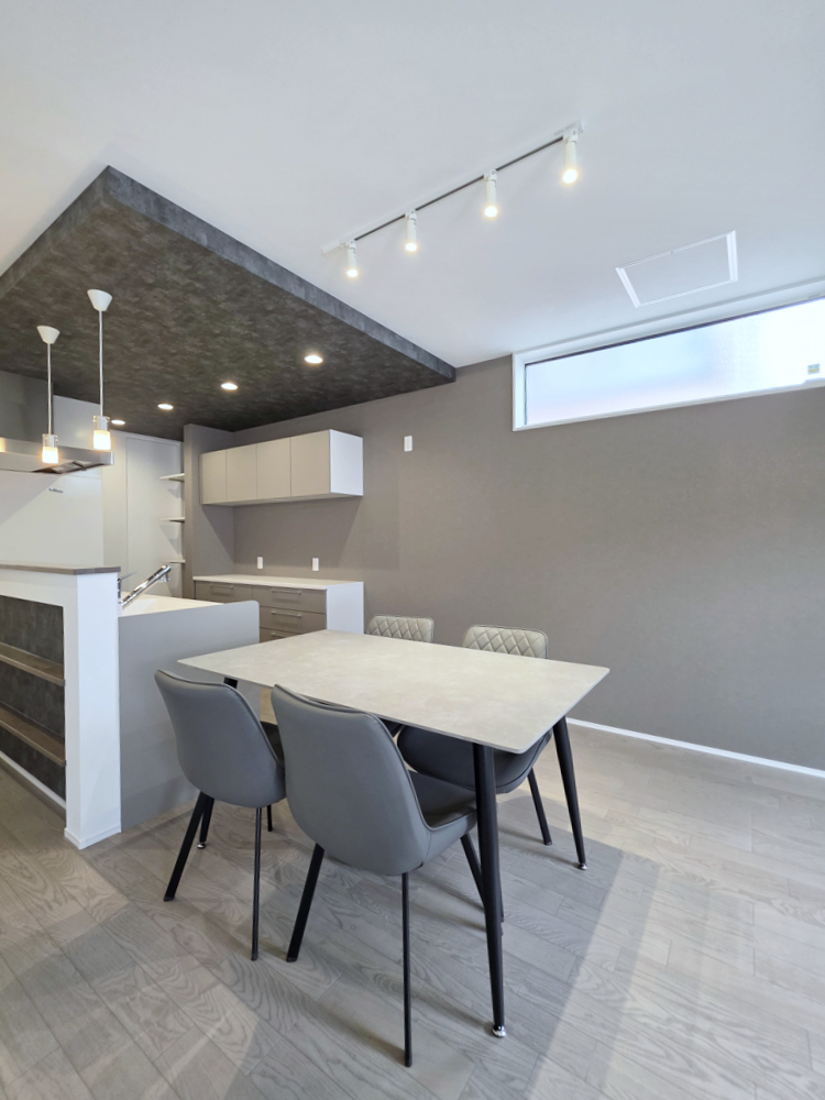 キッチンと横並びで家事効率の良いダイニングスペース。天井にアクセントクロスを採用し、モダンで落ち着いた雰囲気を演出しています。収納豊富なカップボードも備え、整理整頓しやすい仕様です。