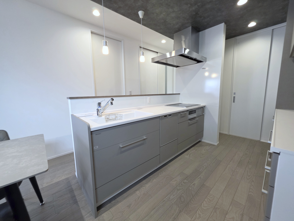 シンプルでスタイリッシュなキッチン。吊り下げ照明とダークトーンの天井がデザイン性を高め、毎日の料理が楽しくなる空間です。