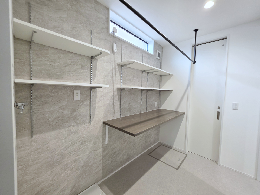 洗濯機置き場とカウンターを備えたランドリールーム。可動棚と室内物干しで使い勝手が良く、効率的に家事がこなせます。