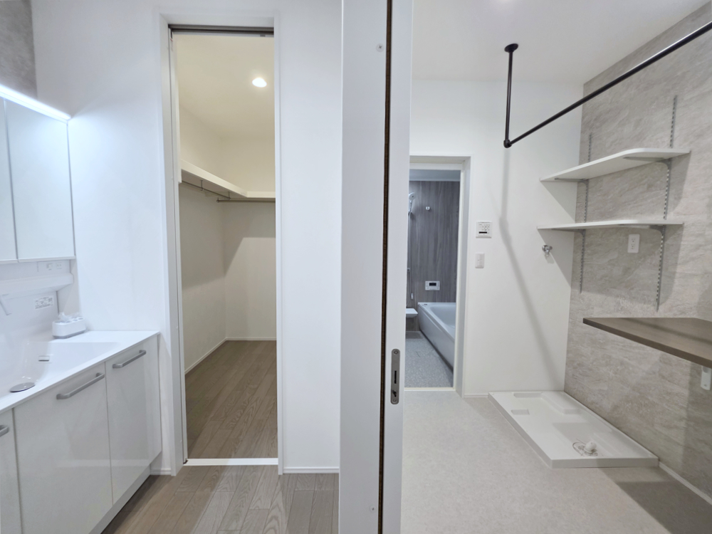 洗面室からファミリークローゼット、ランドリー、浴室まで最短距離で繋がる快適動線。衣類の洗濯から収納までスムーズに完結でき、家事負担を軽減します。