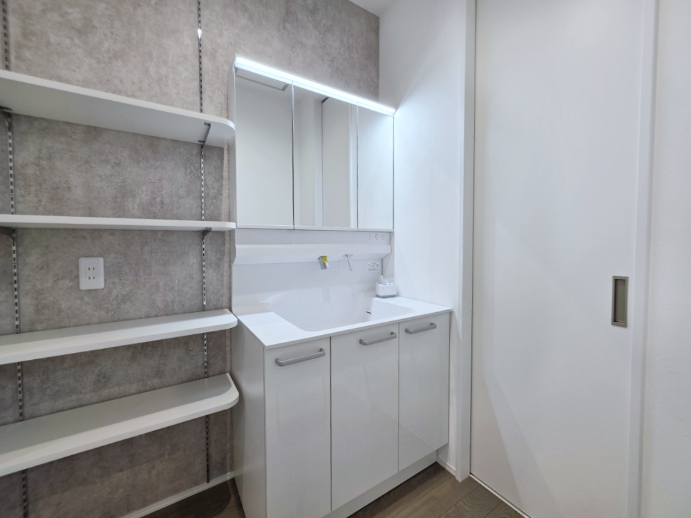 白を基調とした明るい洗面化粧台にグレーのアクセントクロスを合わせました。