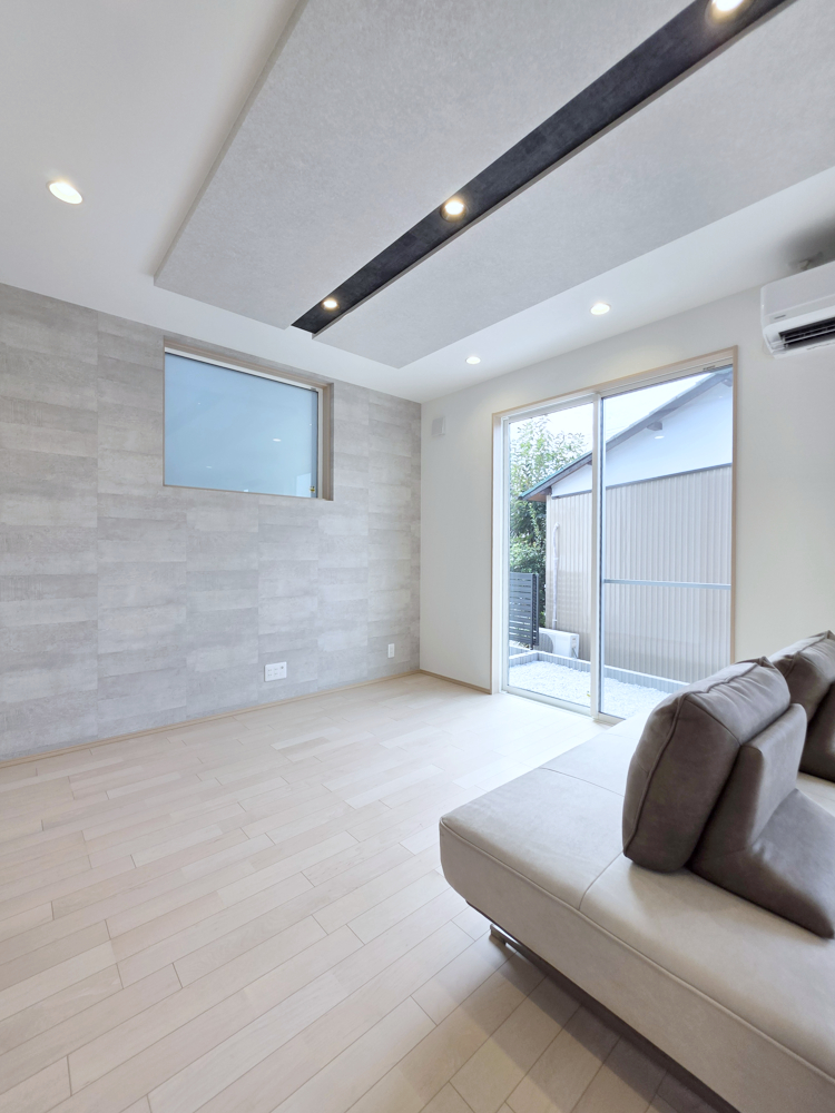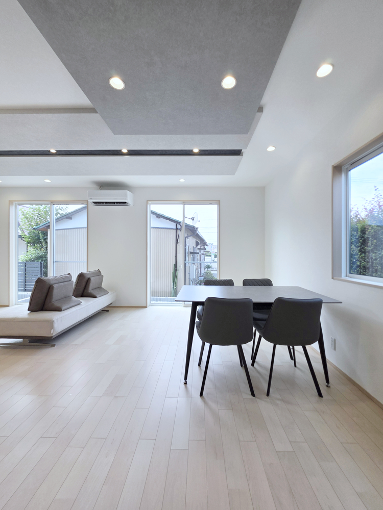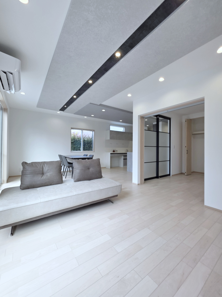 大きな窓もインテリアの一部になるスクエア型!天井のラインとも合わせてかっこいい雰囲気です。