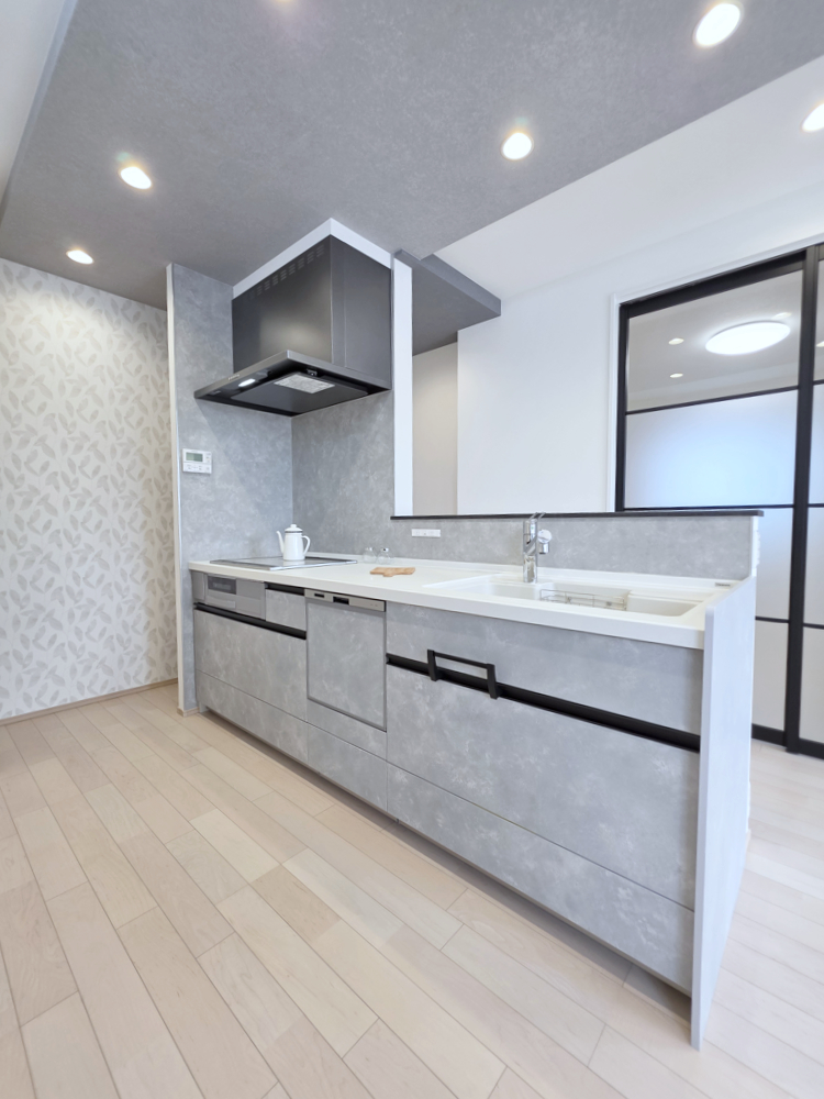 奥のパントリー・カウンタの手元も隠せる使いやすいキッチンです。