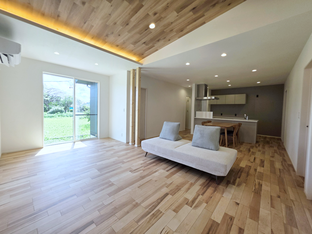 - 木目調のナチュラルなデザインのキッチンを採用しました。キッチンからは1階全体を見渡すことができます。