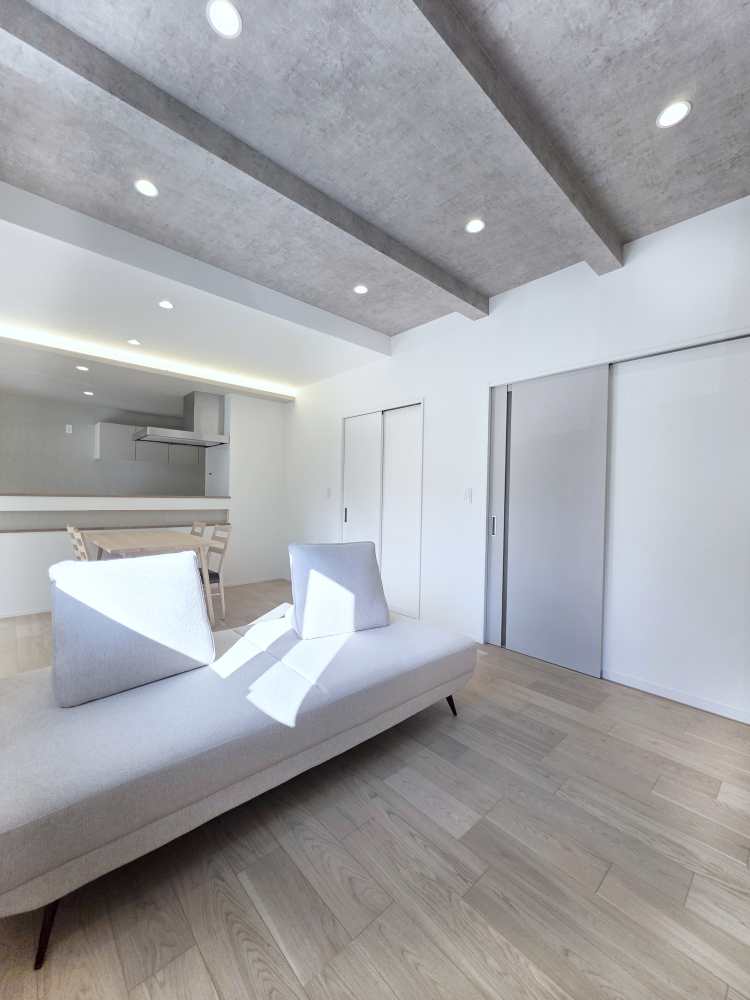 日当たりの良いリビングは、天井の見せ梁とダウンライトがアクセントになりオシャレな空間となっています。