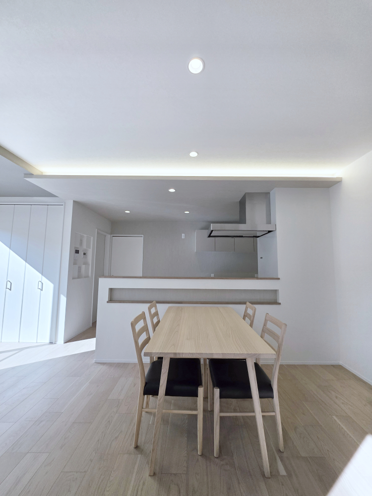 間接照明がやわらかく照らすダイニングは、LDKの中心にあることで、家族のつながりを感じられる暖かなスペースです。