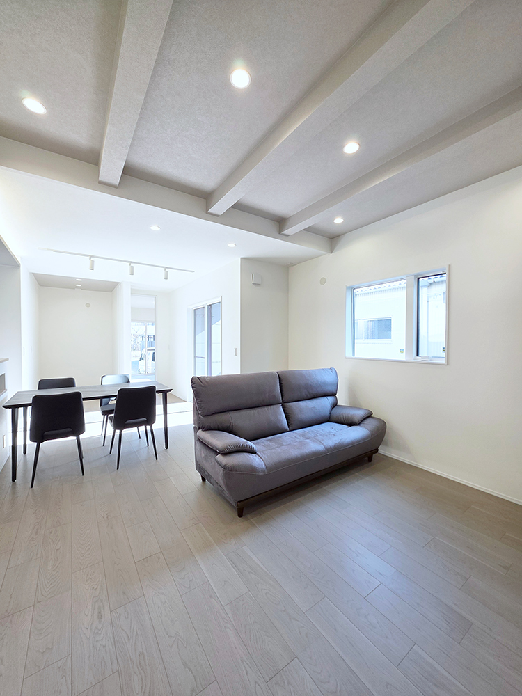 テレビ背面にグレーのクロスを採用し、LDK全体をグレーで統一しました♪どんなインテリアにも馴染むグレーでお好みの空間にできます!