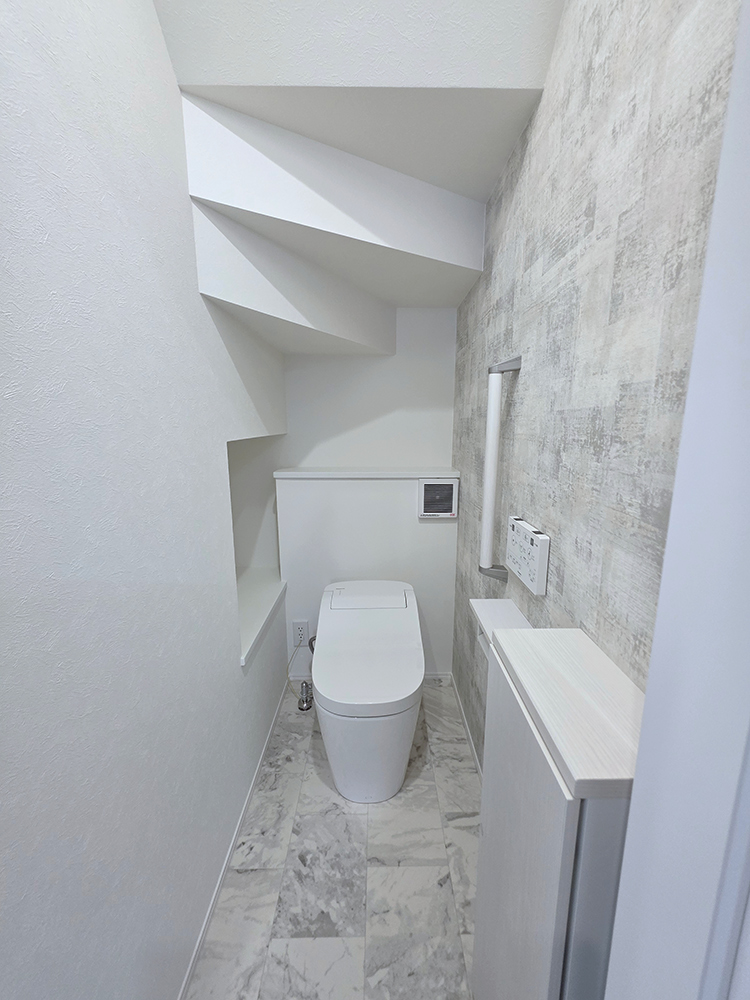 白を基調とした空間に、クロスとフローリングに柄を取り入れ