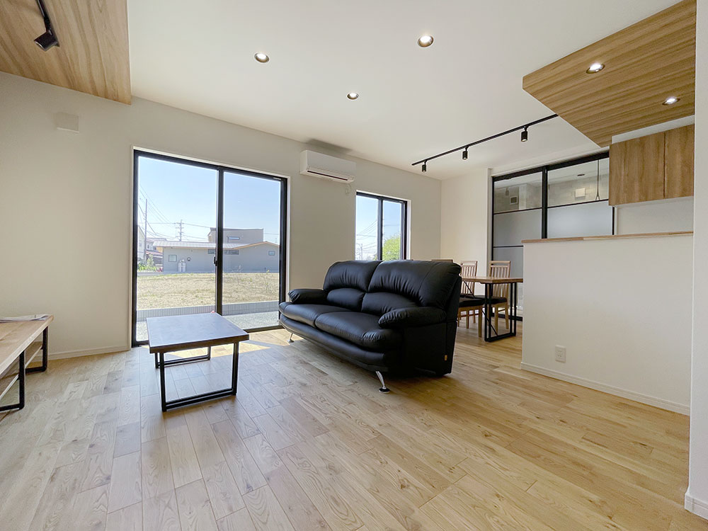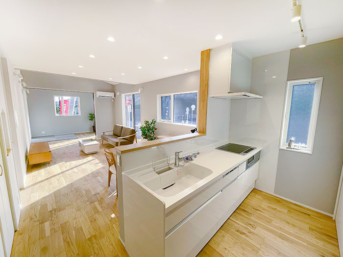 大注目の北欧風の素敵なお家です♪ キッチンからリビングダイニングが見渡せる直線型LDK!カスタヌックを開けば約23帖のひろびろとした空間としても使えるリビング充実の間取りです。
