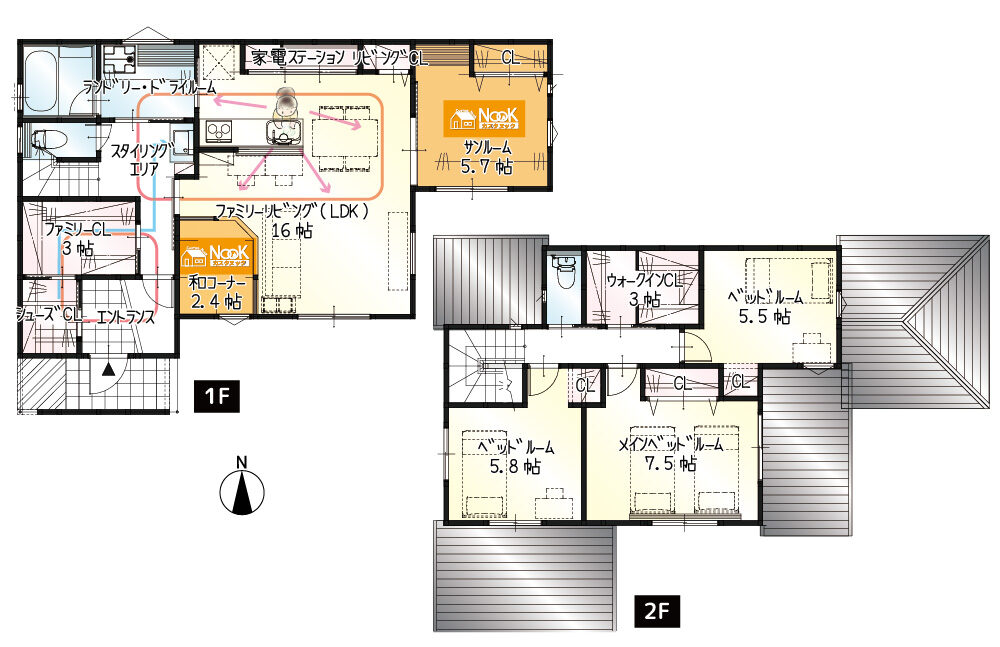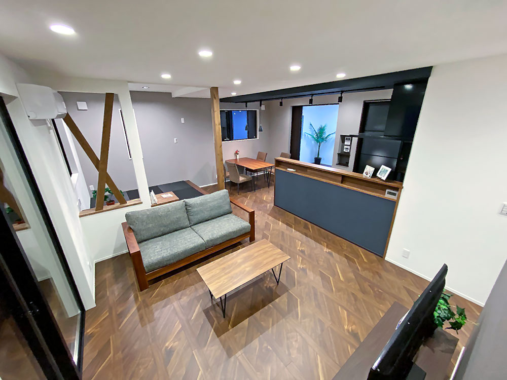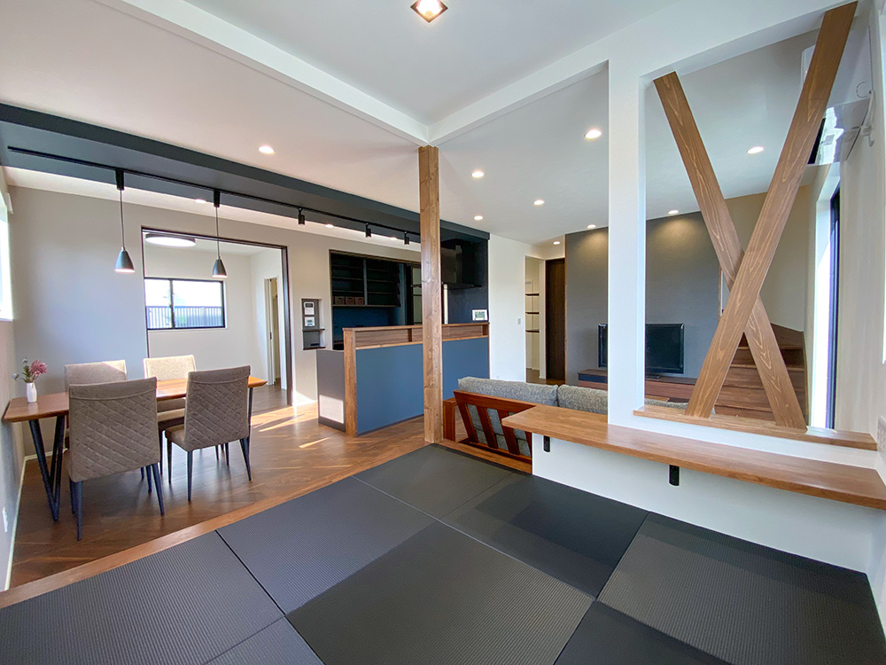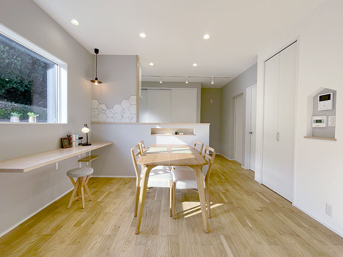 帰宅・生活・家事動線をすべて兼ね備えたストレスフリーなお家になります。キッチンから目の届く場所に和コーナーをつくりました。