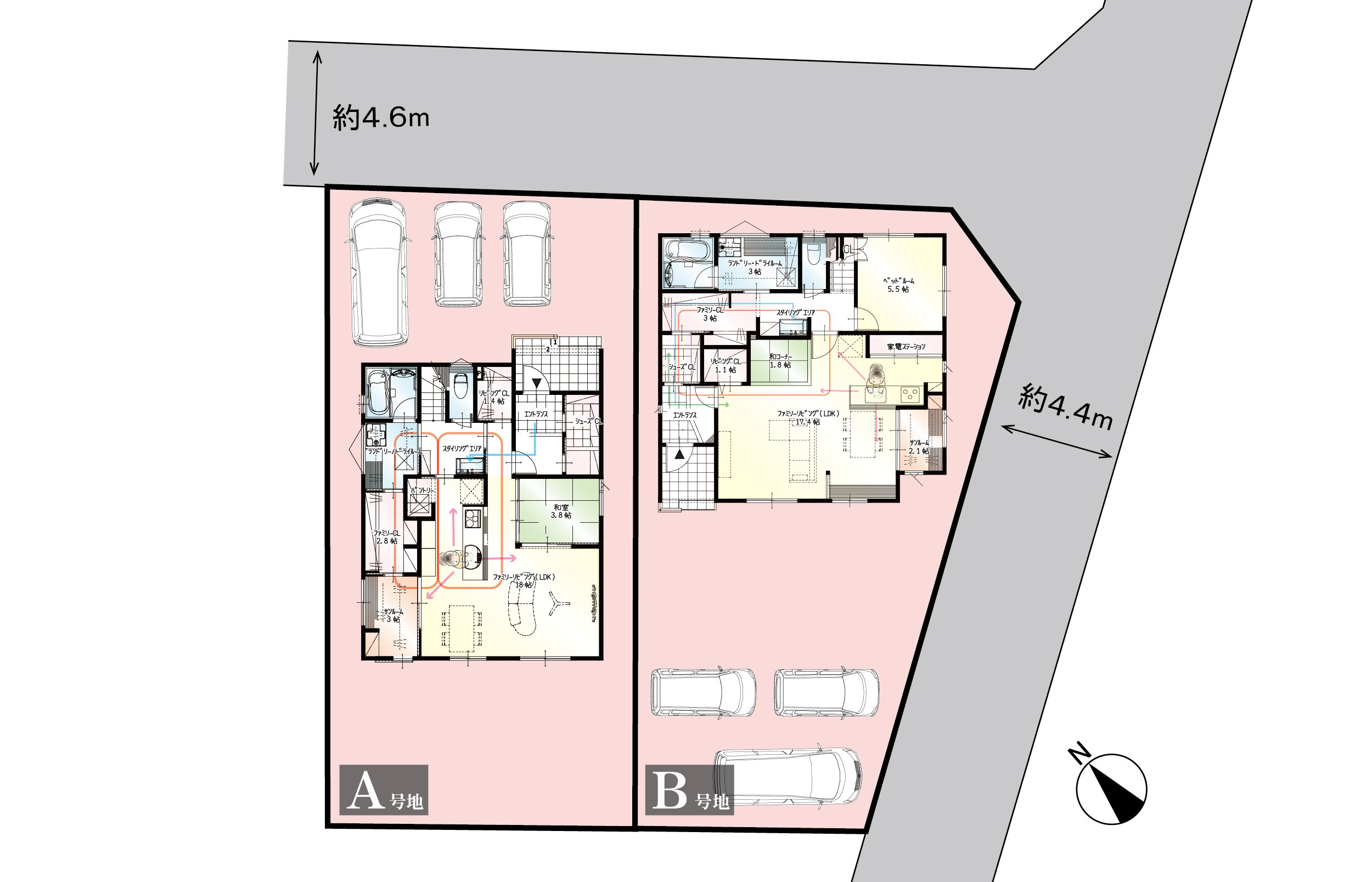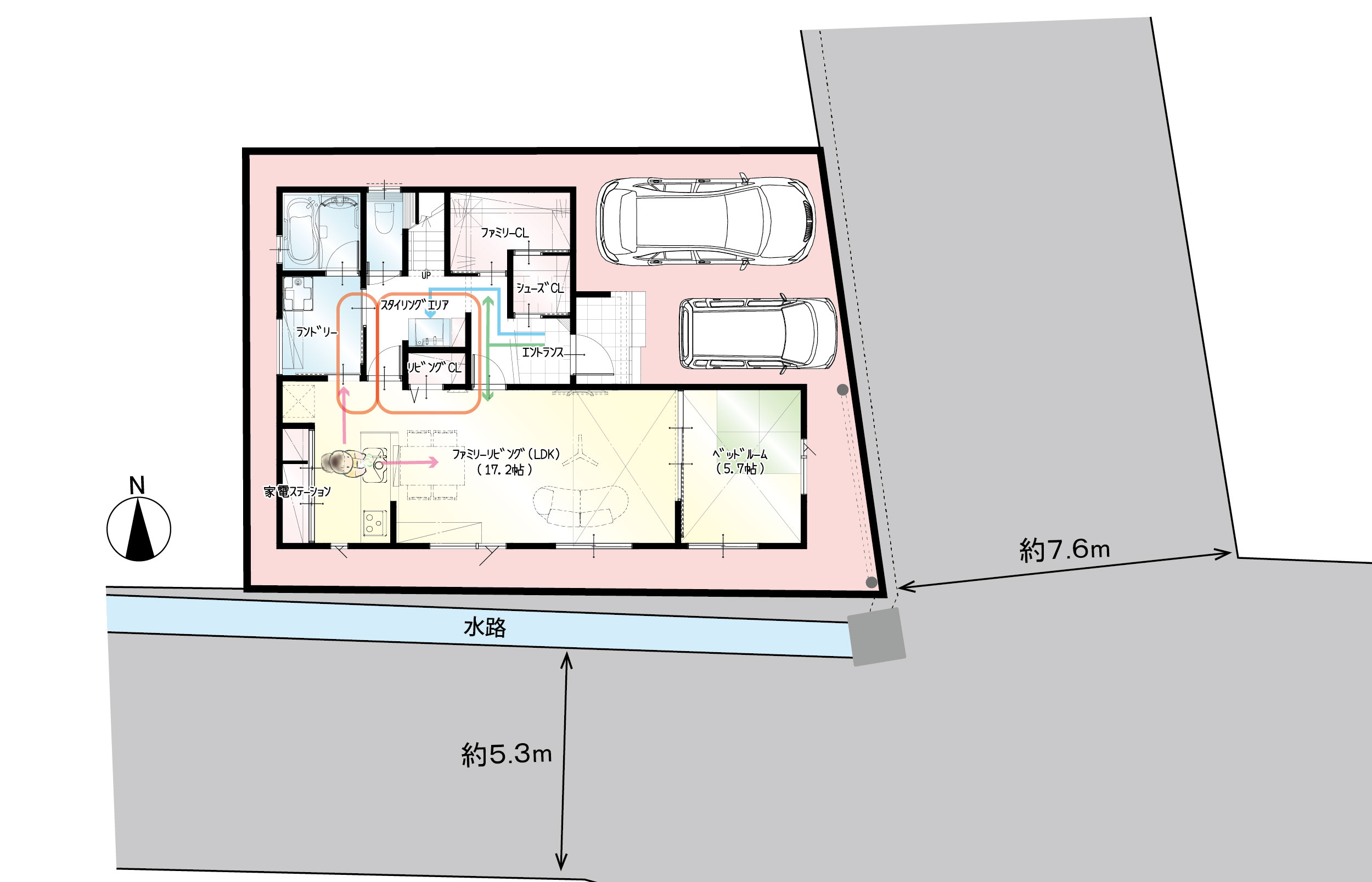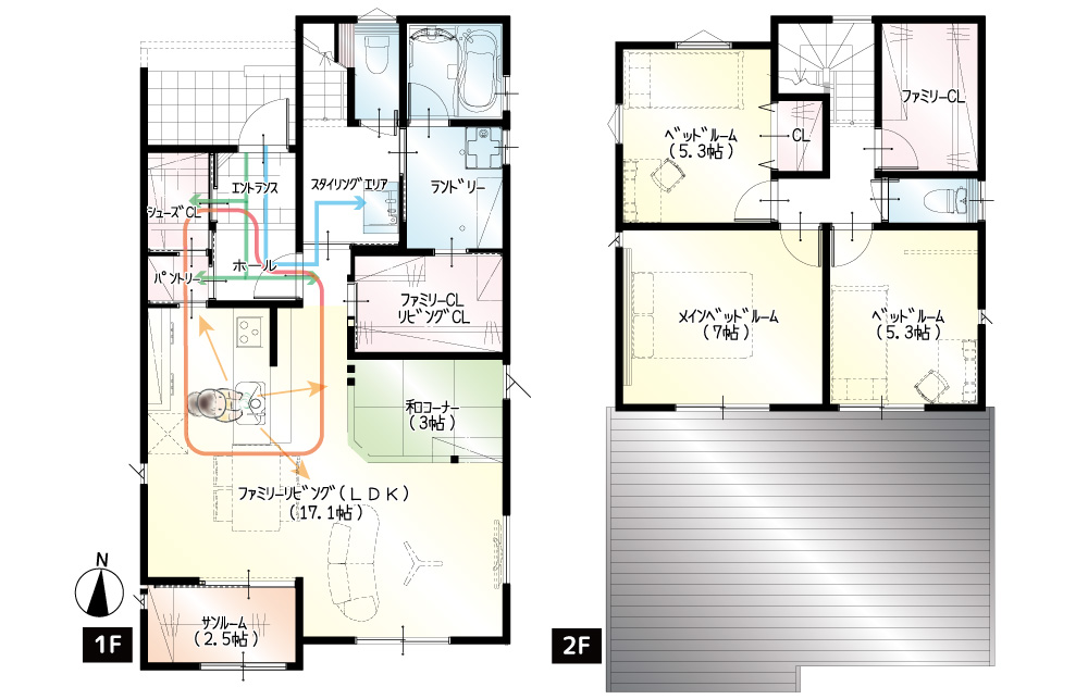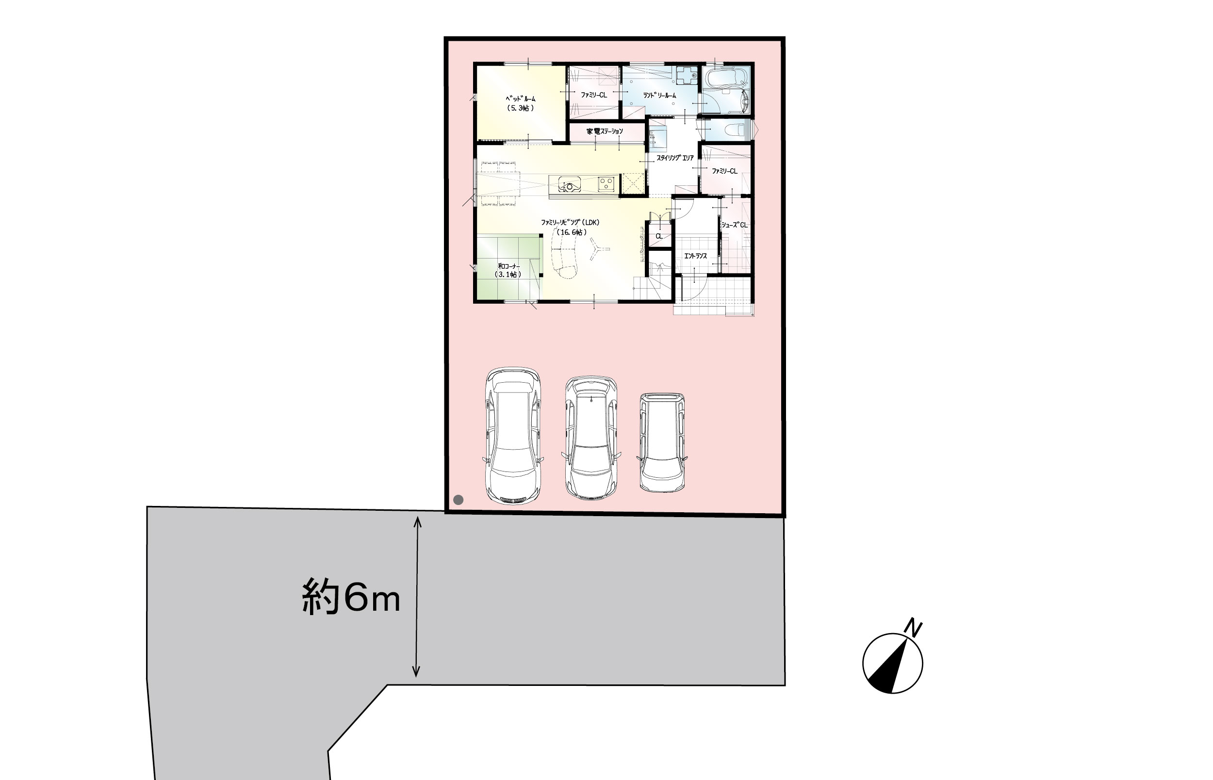 行き止まりのない回遊できるお家になります。玄関収納だけで支度が完結できる収納量!洗濯機乾燥、浴室乾燥、室内干し派の方におすすめのひろびろランドリールーム付きです。