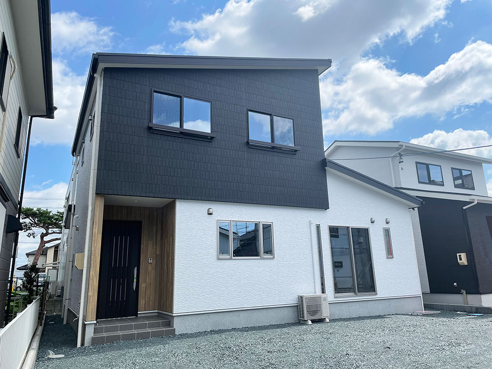 ウッドデッキが付きました!自転車(2台分)が雨に濡れないように配慮した和モダン風外観デザインのお家になります。1階で生活したい!という方におすすめの間取りです。