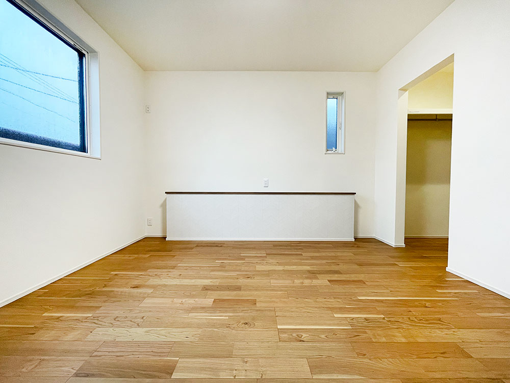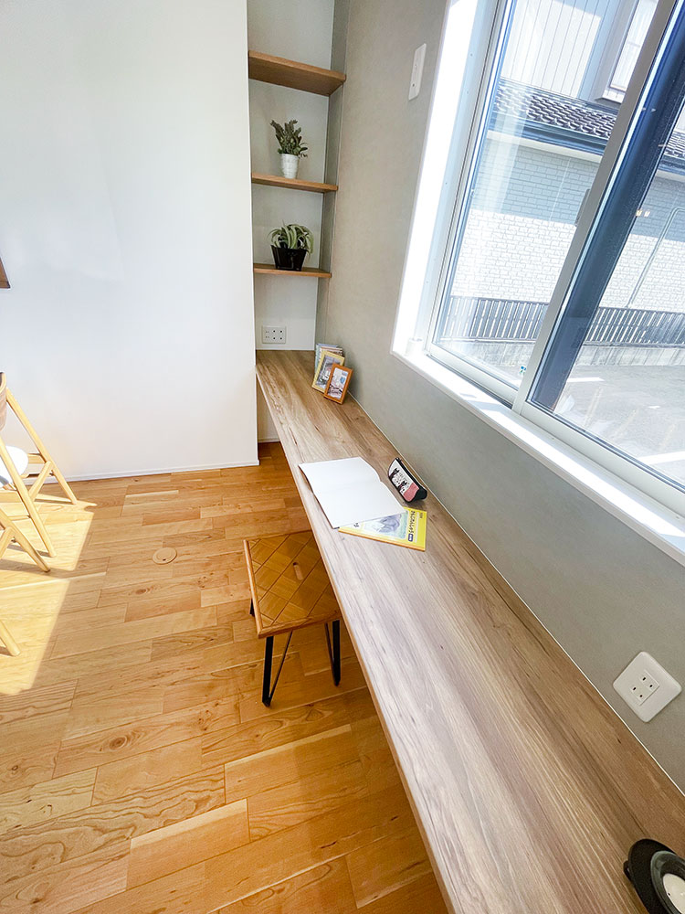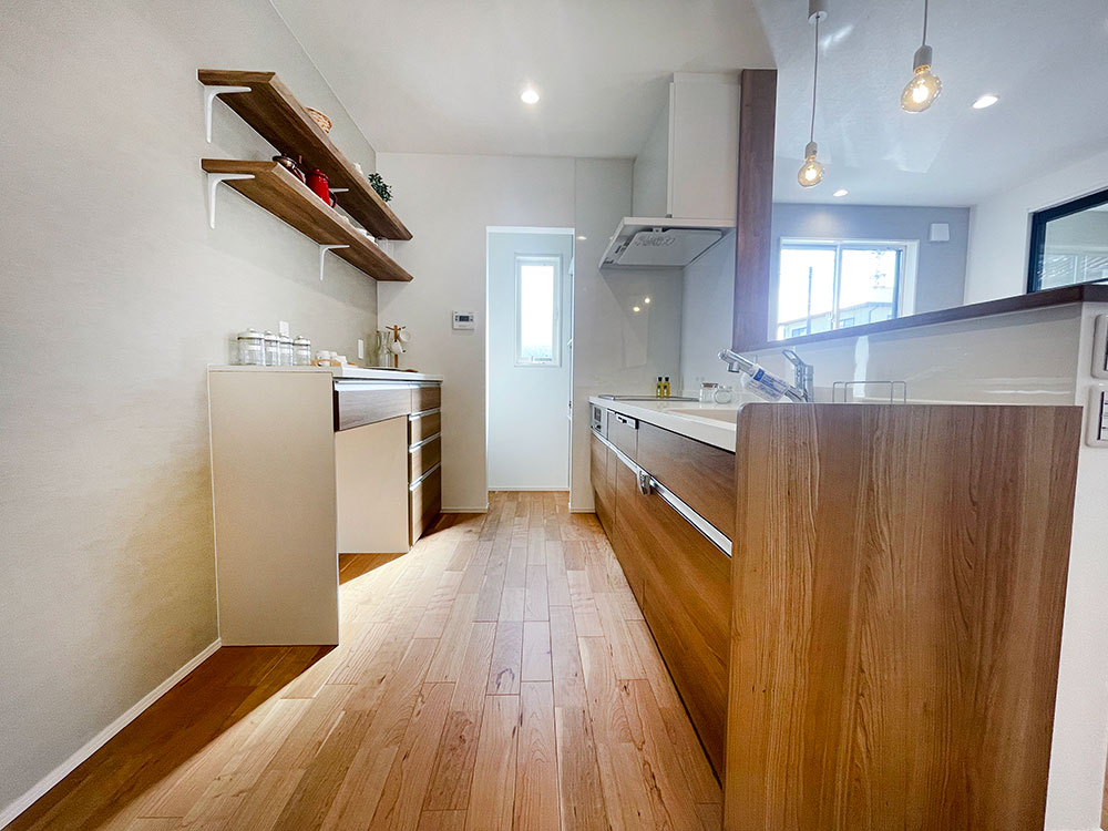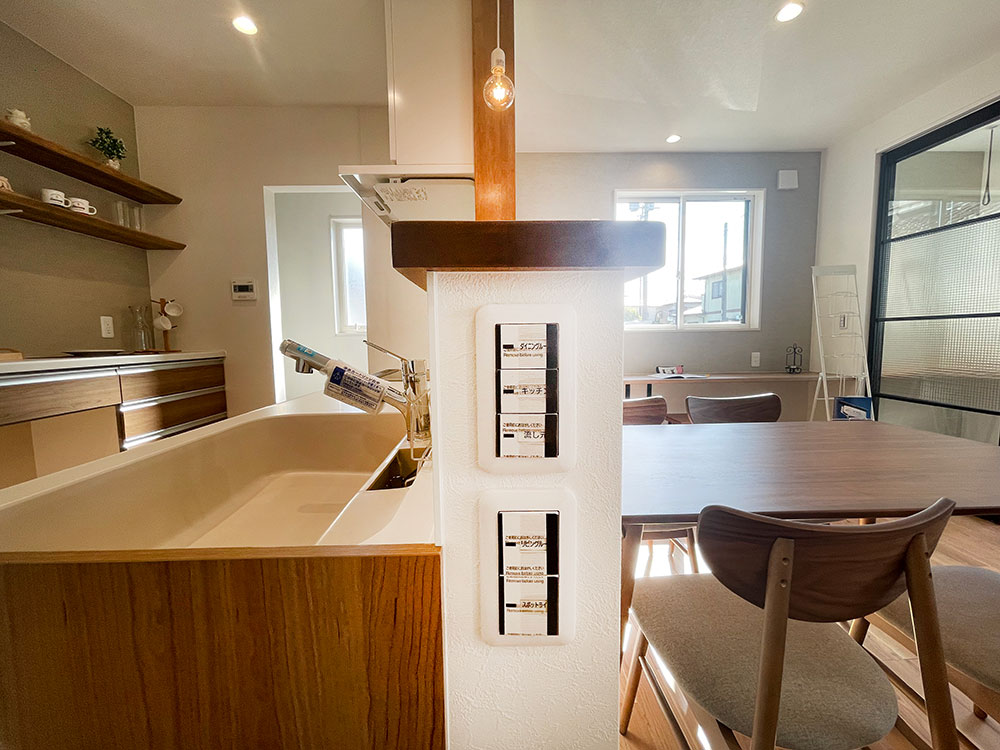 キッチン横に和コーナーのあるお家になります。LDKのどこにいても家族の様子が見渡せるような配置にしました。キッチン裏に洋室があるので、子育て寝室としても最適です。
