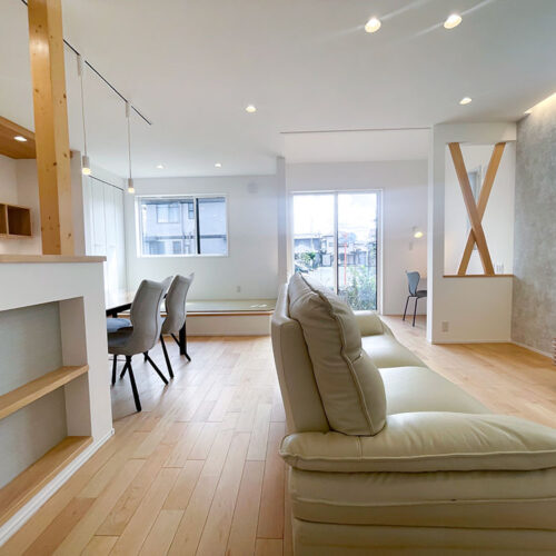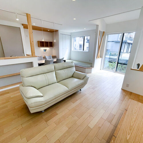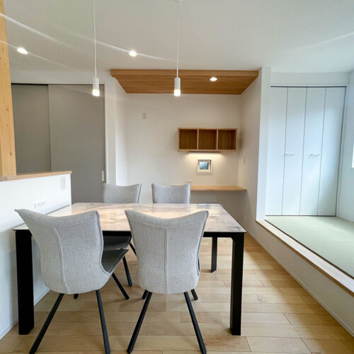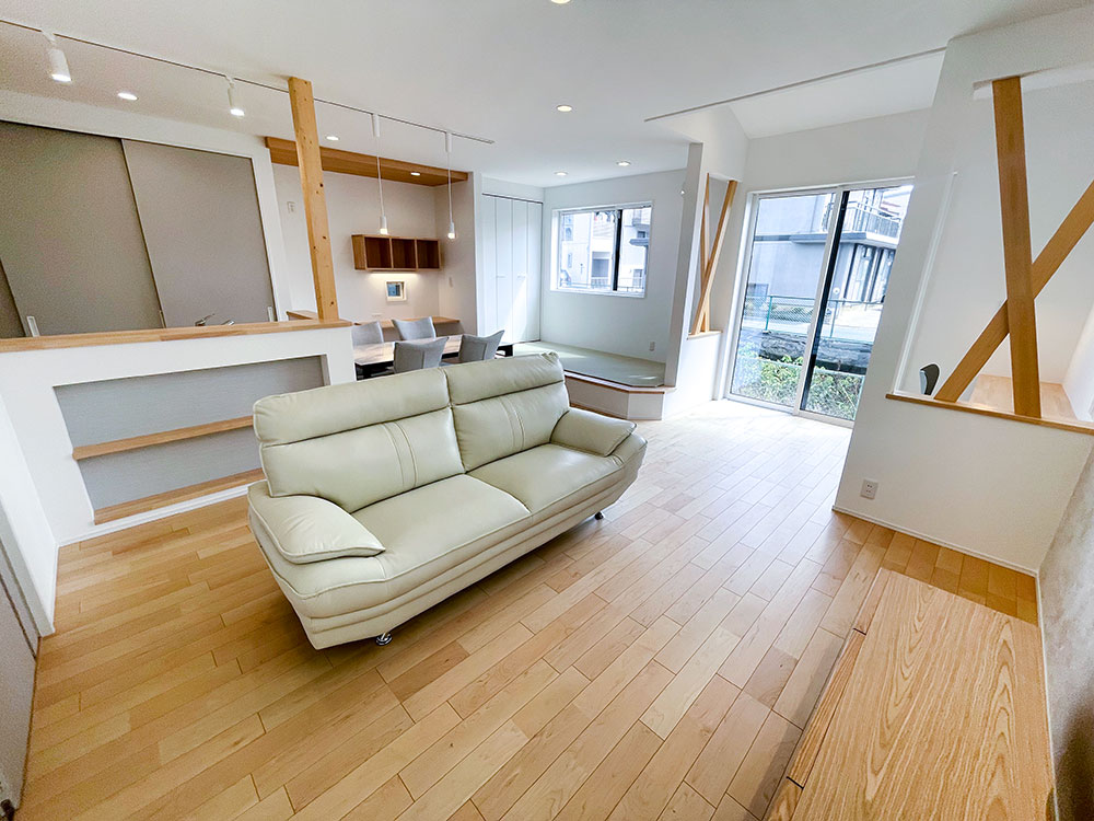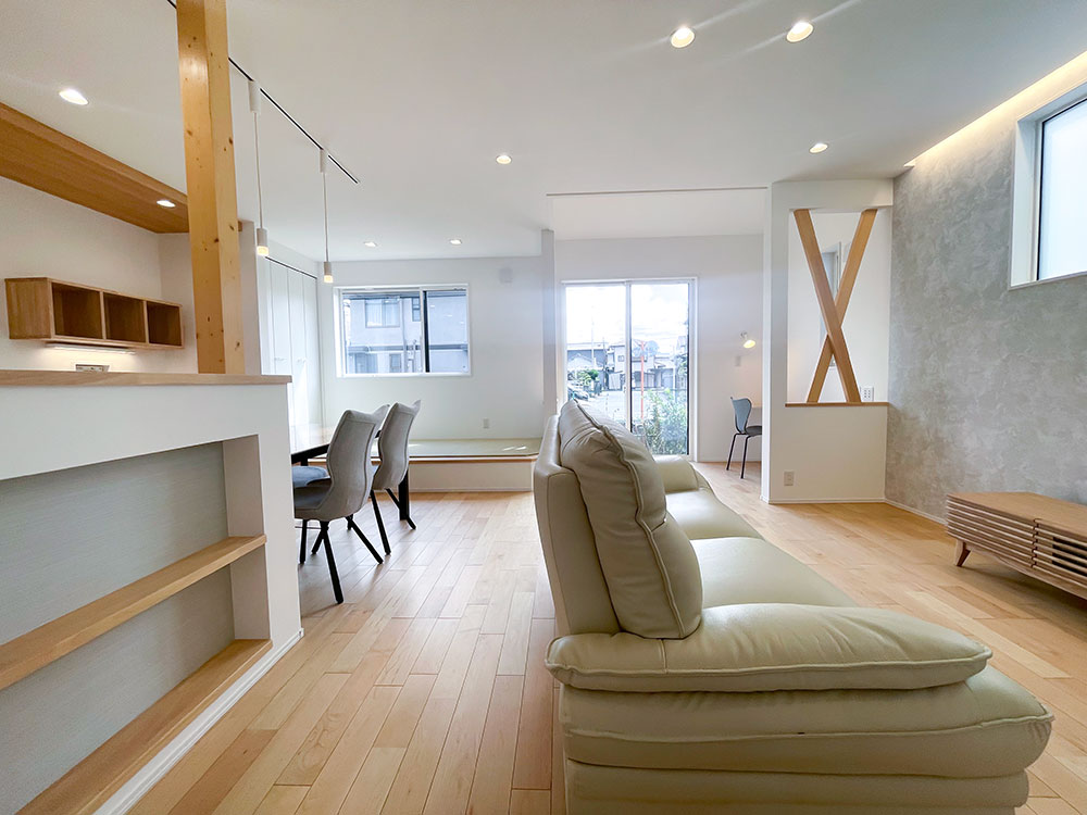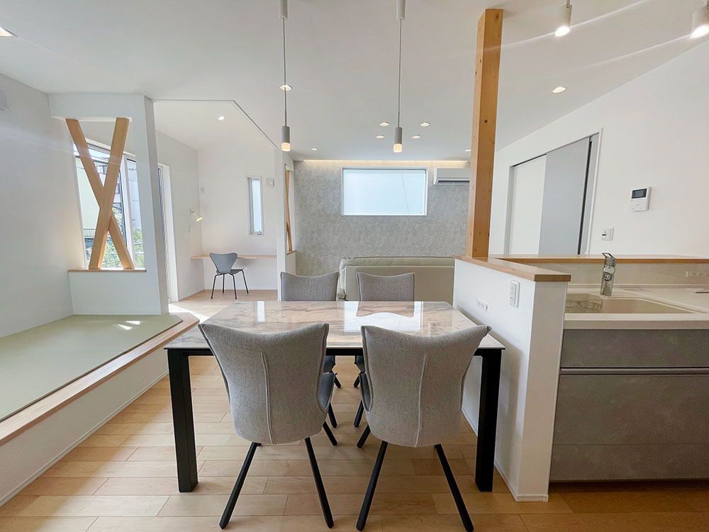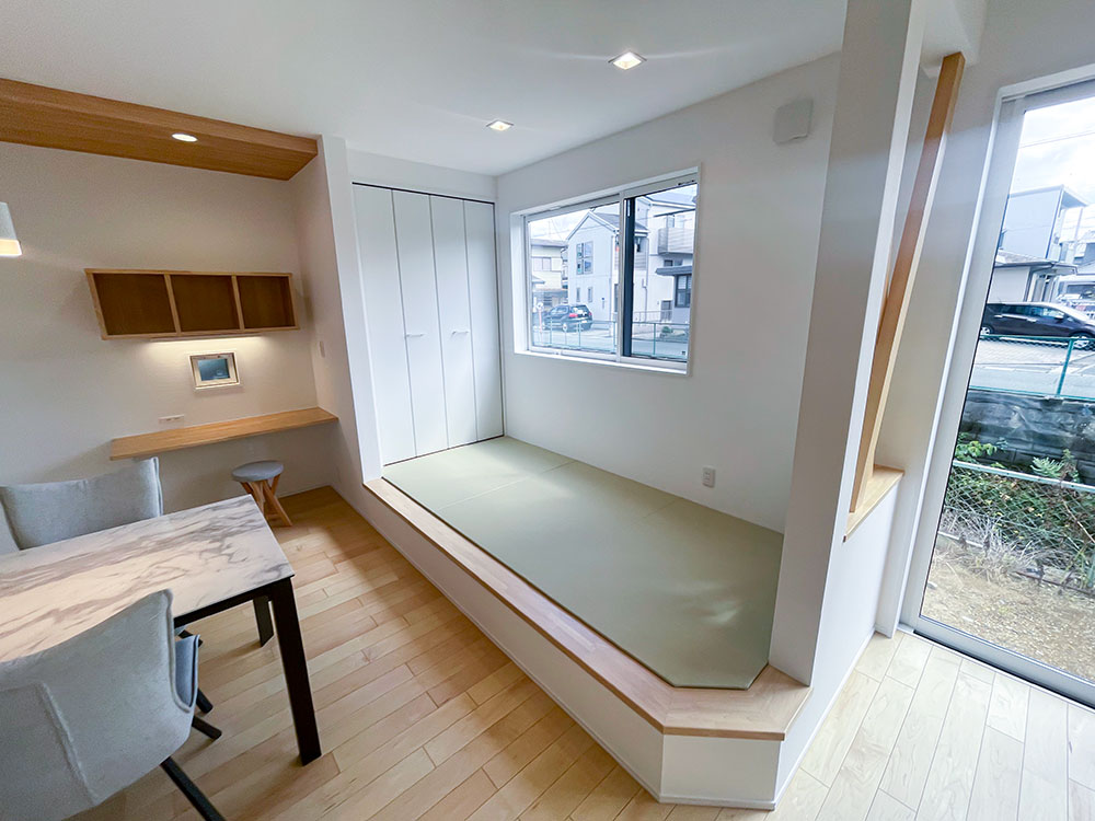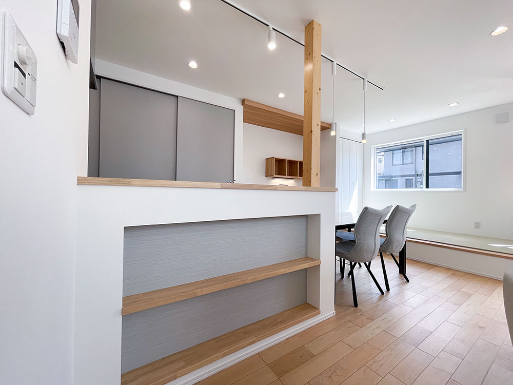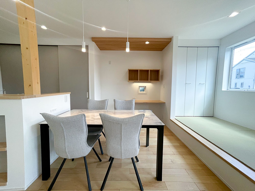 リビングにある小上がり和コーナーが空間の広さを感じさせます♪さらに自由な使い方ができるカスタヌックで、気ままにゆったりしたライフスタイルを実現♪玄関からサッと手洗いに向かえる帰宅動線や、乾いた洗濯物をすぐに収納できるファミリークローゼットなども!