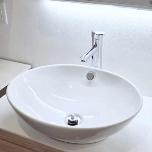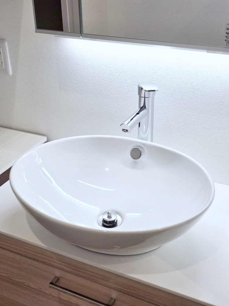 オーラは、傷がつきにくい美しい光沢の陶器製ベッセルボウル&人工大理石製カウンターが特徴。鏡表面のはっ水加工で水滴と油をはじくため、汚れがつきにくく、かるく拭くだけでキレイに取れます。