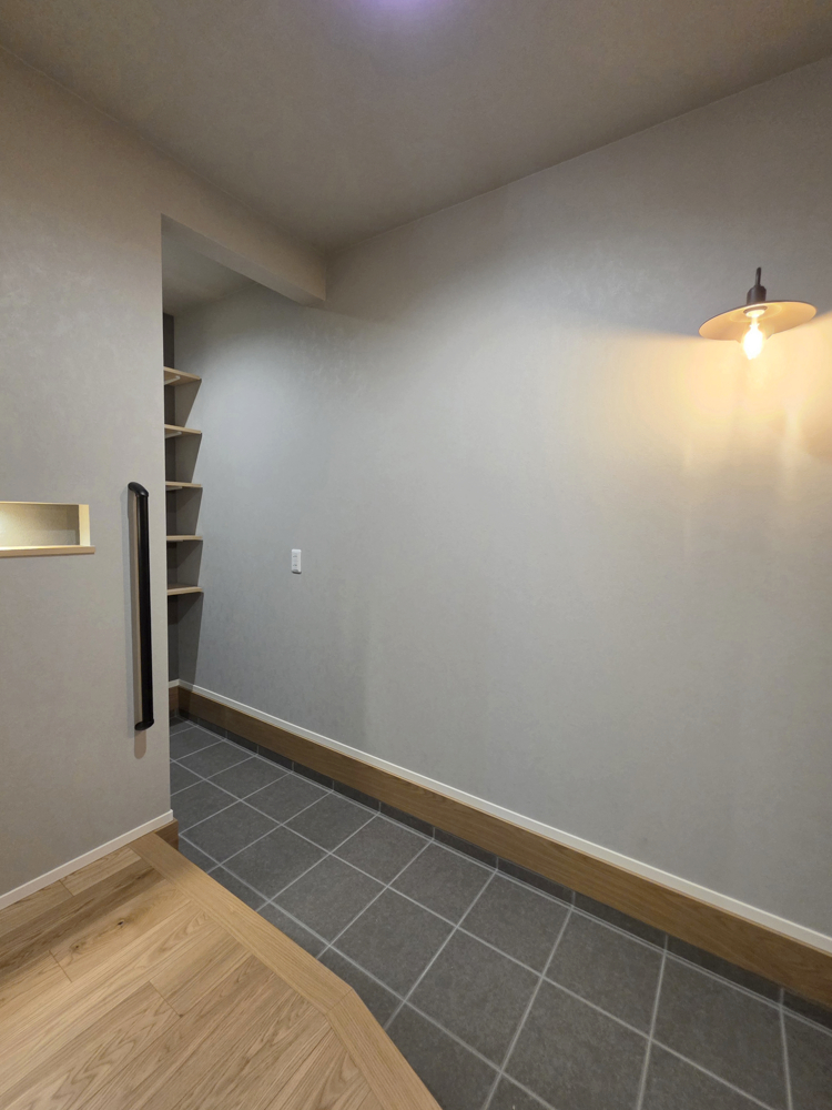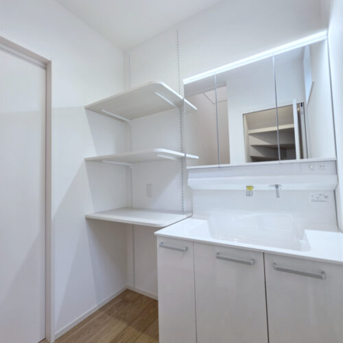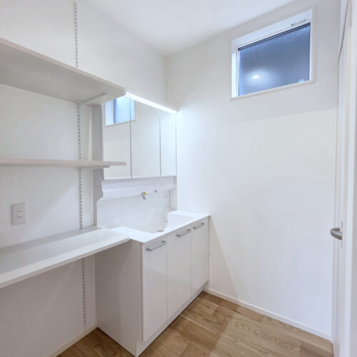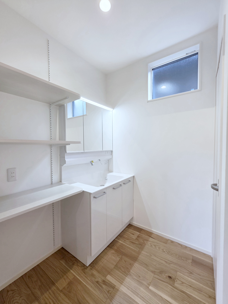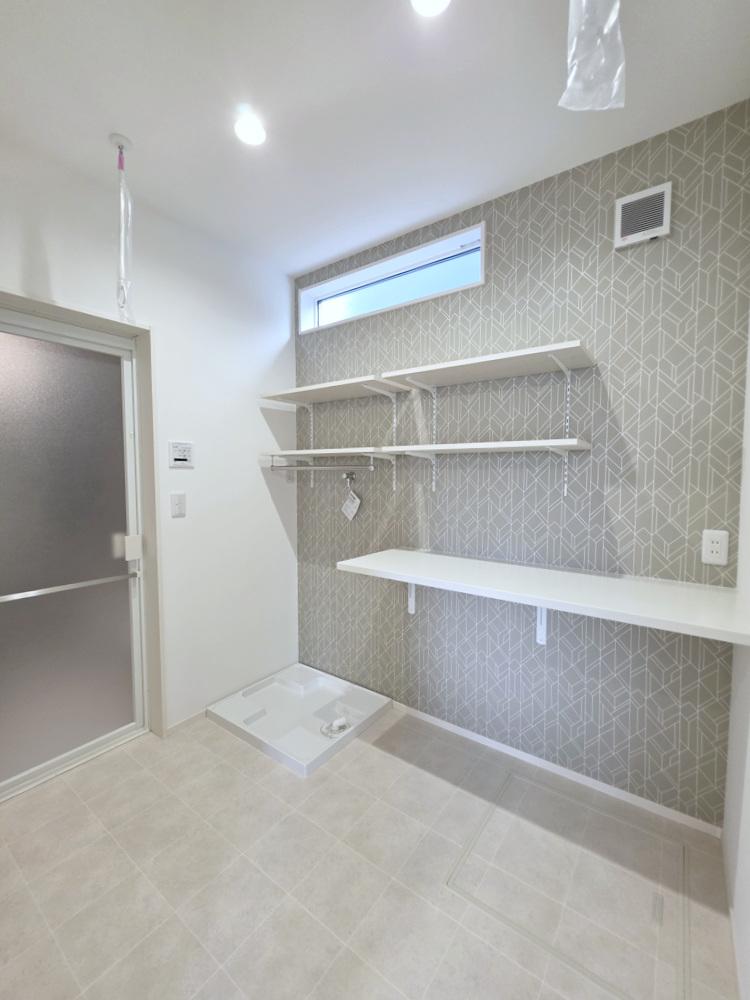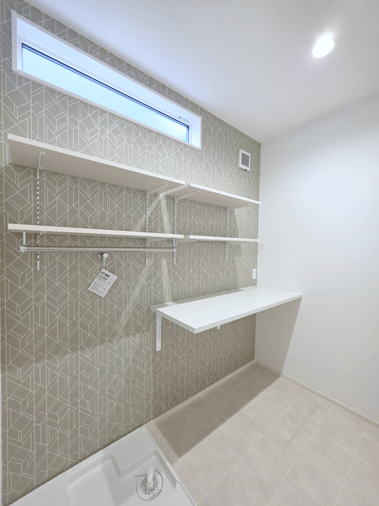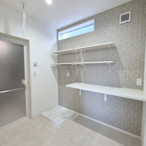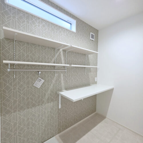 約2.5帖の開放的なランドリールームは、天井物干しで洗濯物を効率的に乾かせます。奥行50cmのカウンターと可動棚は、洗濯物を畳んだりアイロンがけに便利です。
