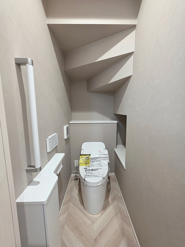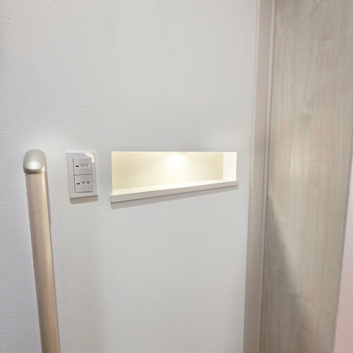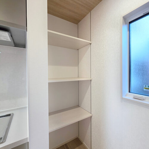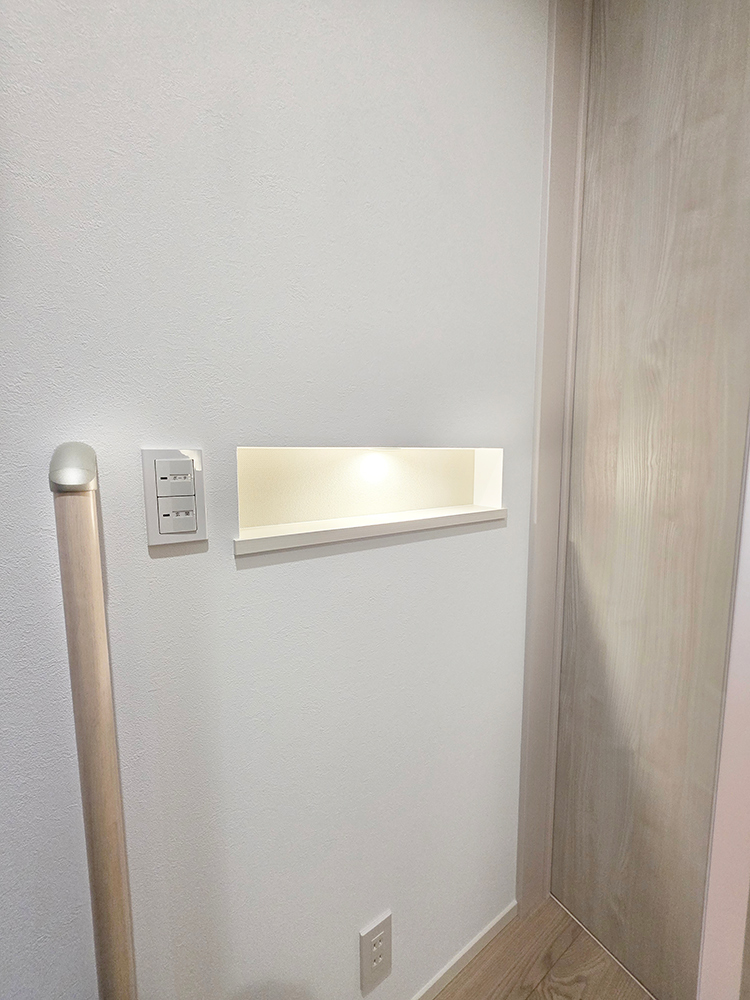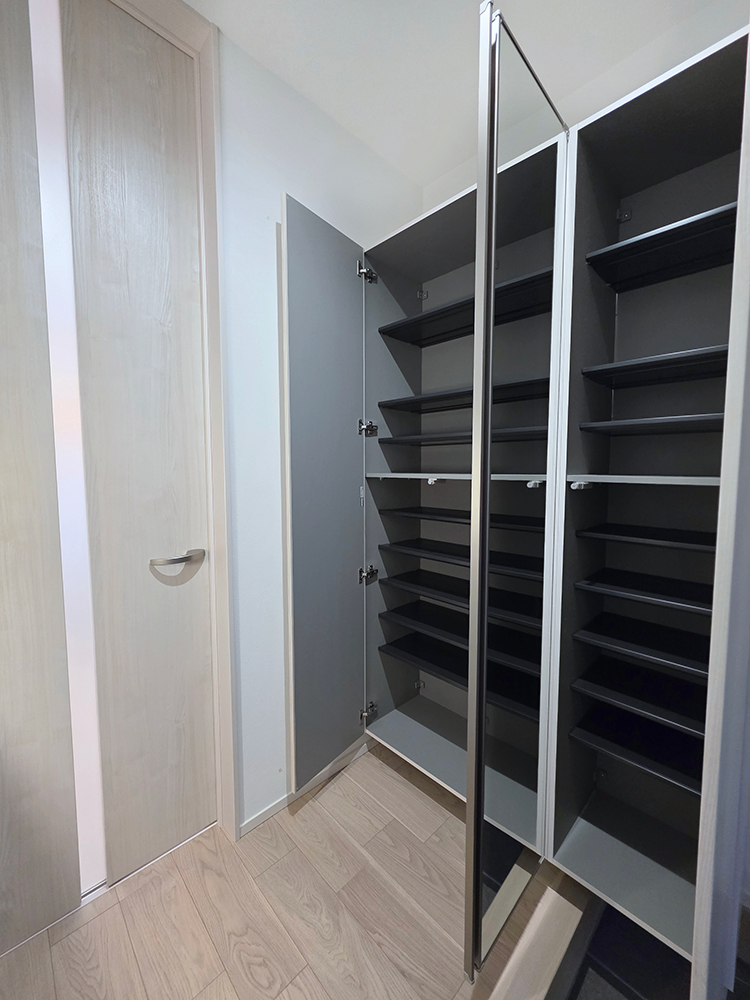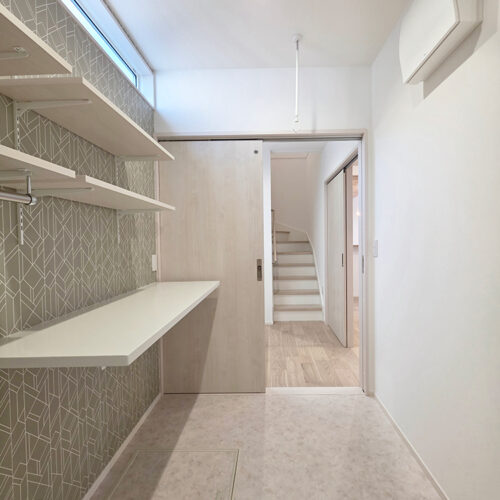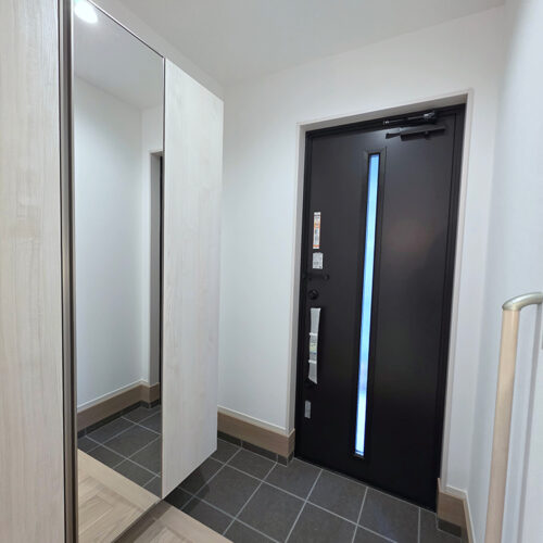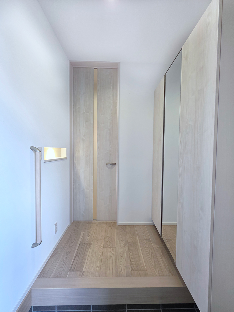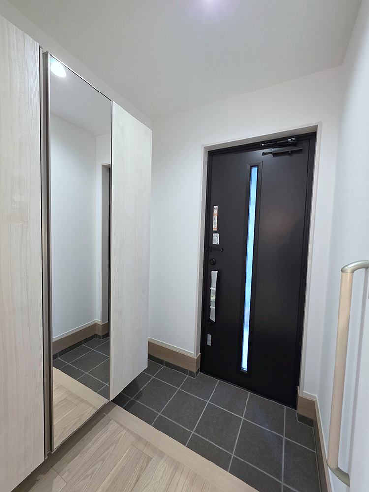 エントランスは広々!シューズBOXには出勤時に便利な1面鏡を配置し、大容量のご家族の靴類を収納できます。北面にはウェルカムニッチがあり、季節のインテリアを飾ったり出来ます。