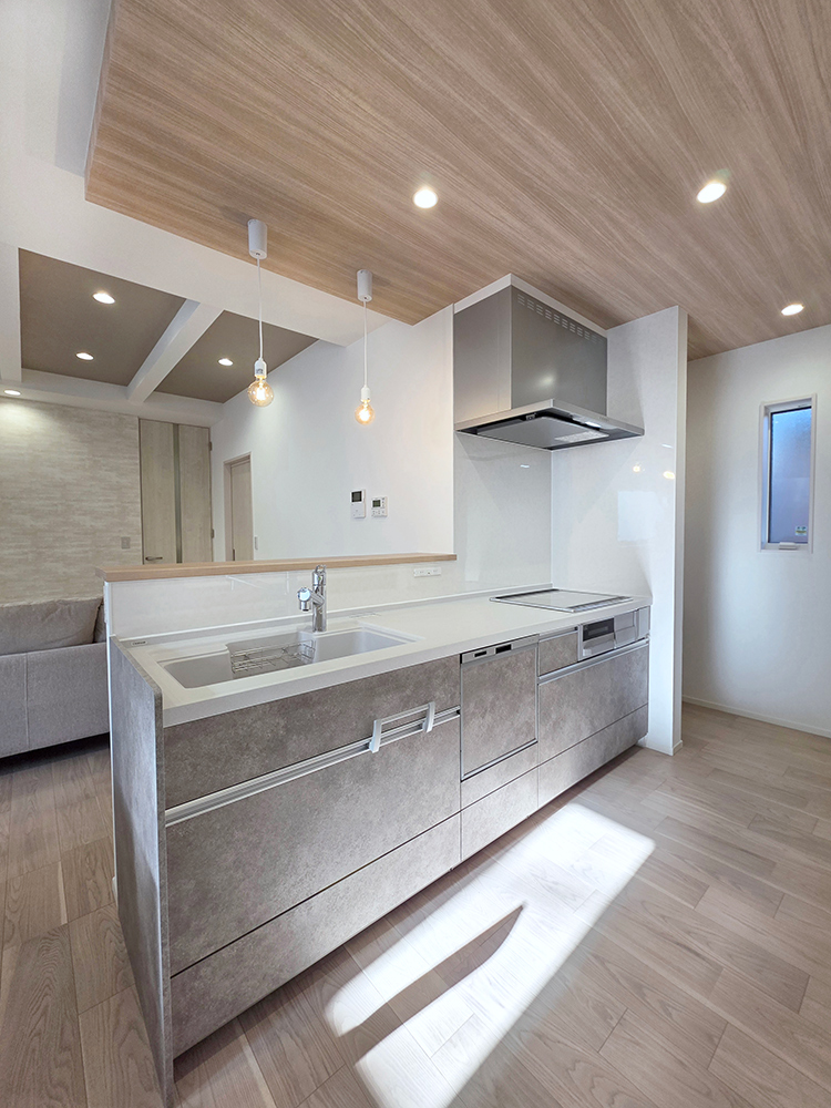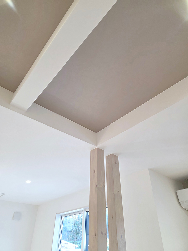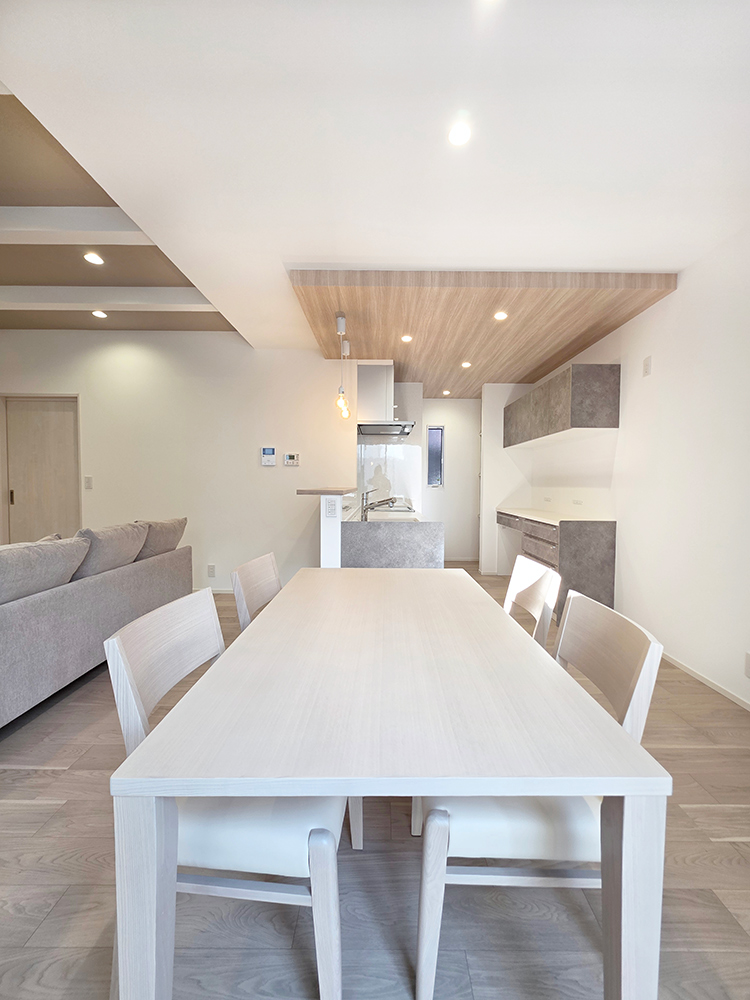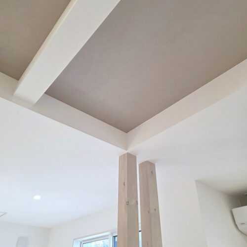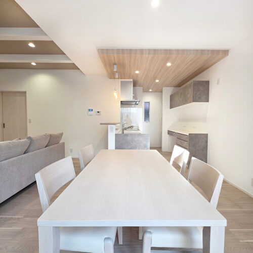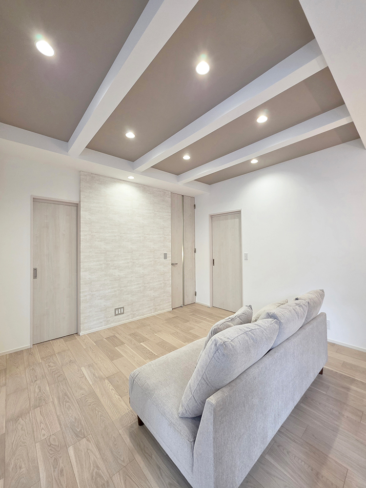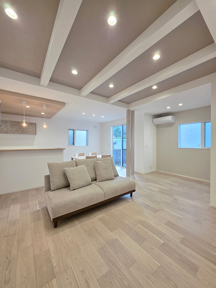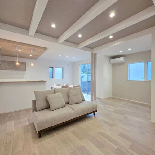 リビング上部には折上天井・梁見を計画し、デザイン性を持たせました。南面の光をなるべく取り入れ開放感のあるリビングスペースとなっております。