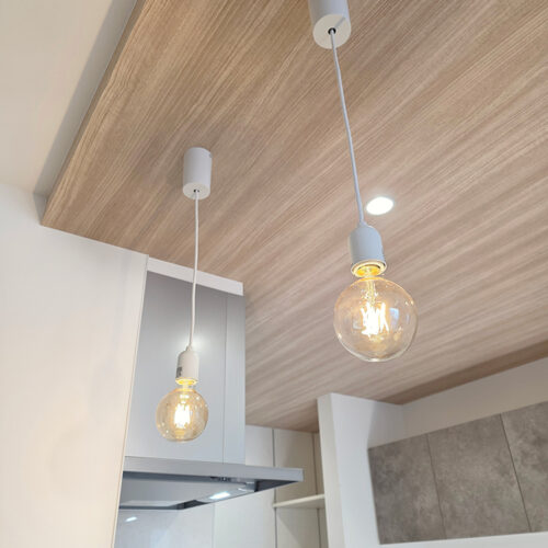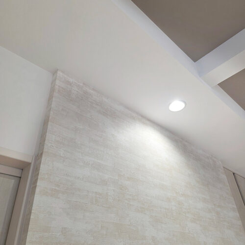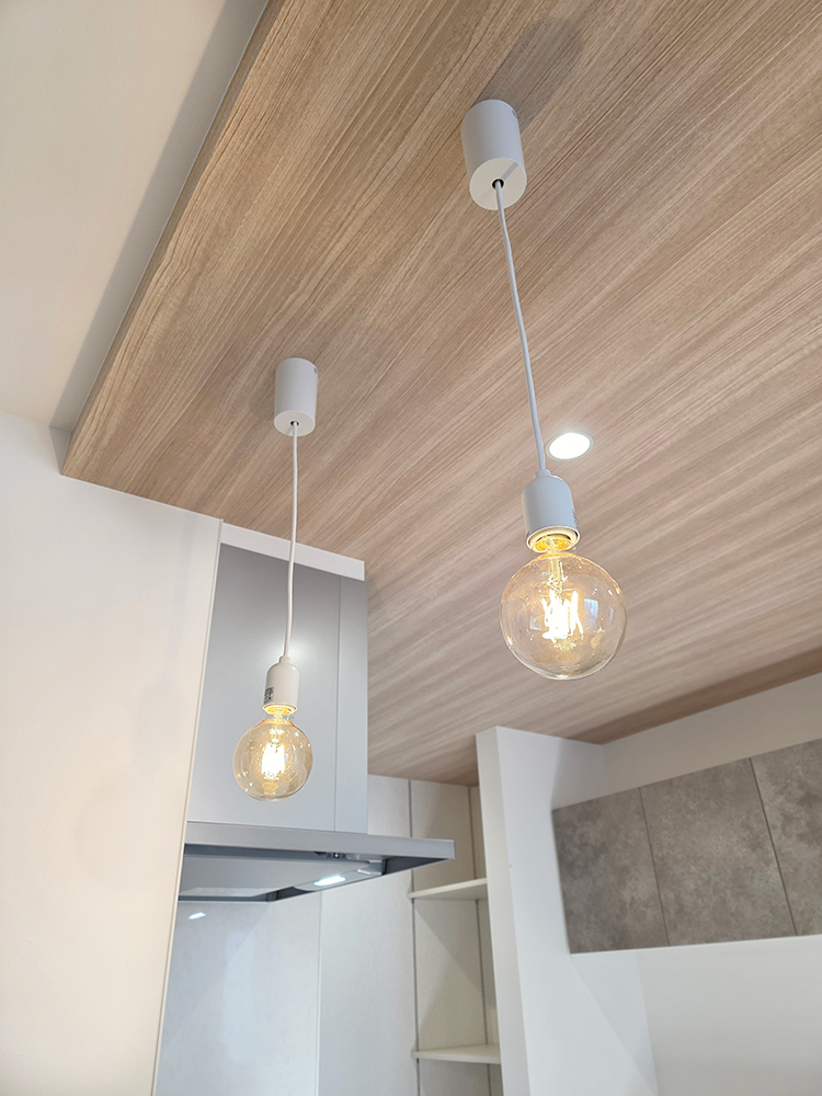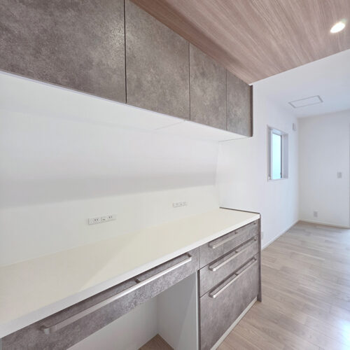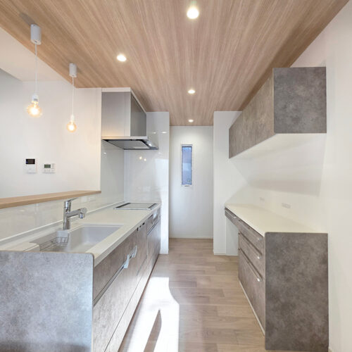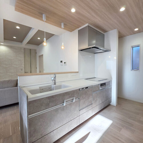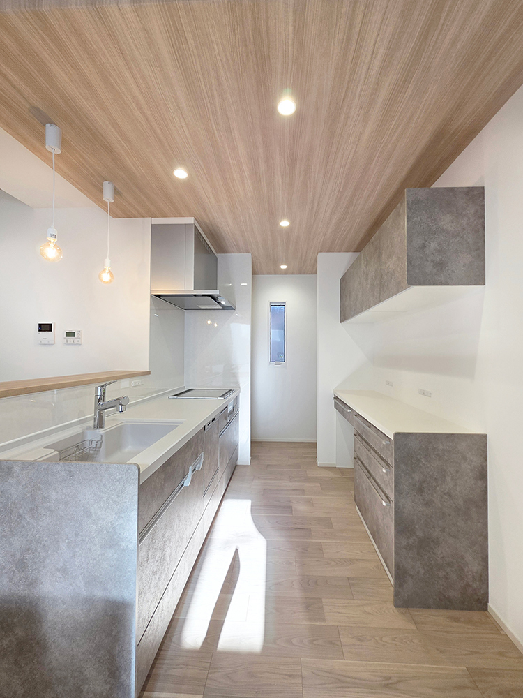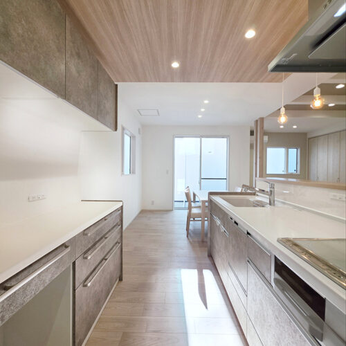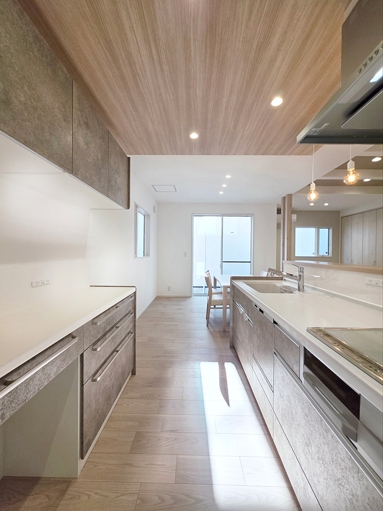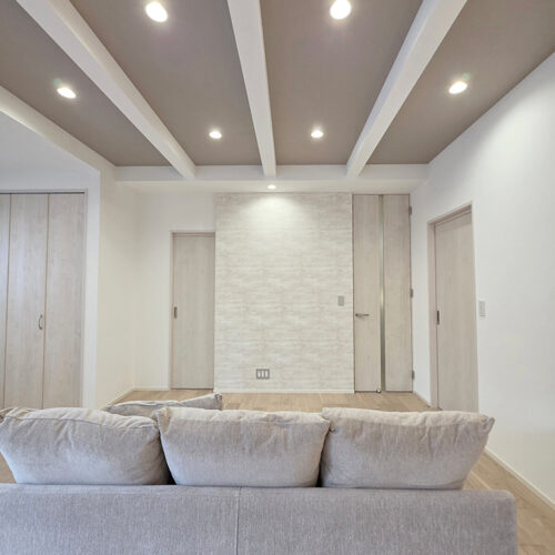 リビング上部には折上天井・梁見を計画し、デザイン性を持たせました。南面の光をなるべく取り入れ開放感のあるリビングスペースとなっております。