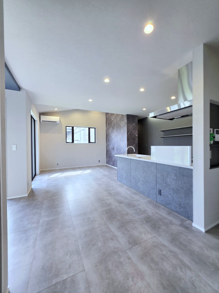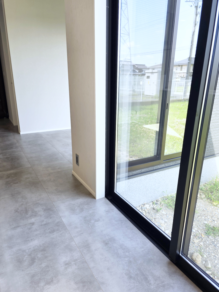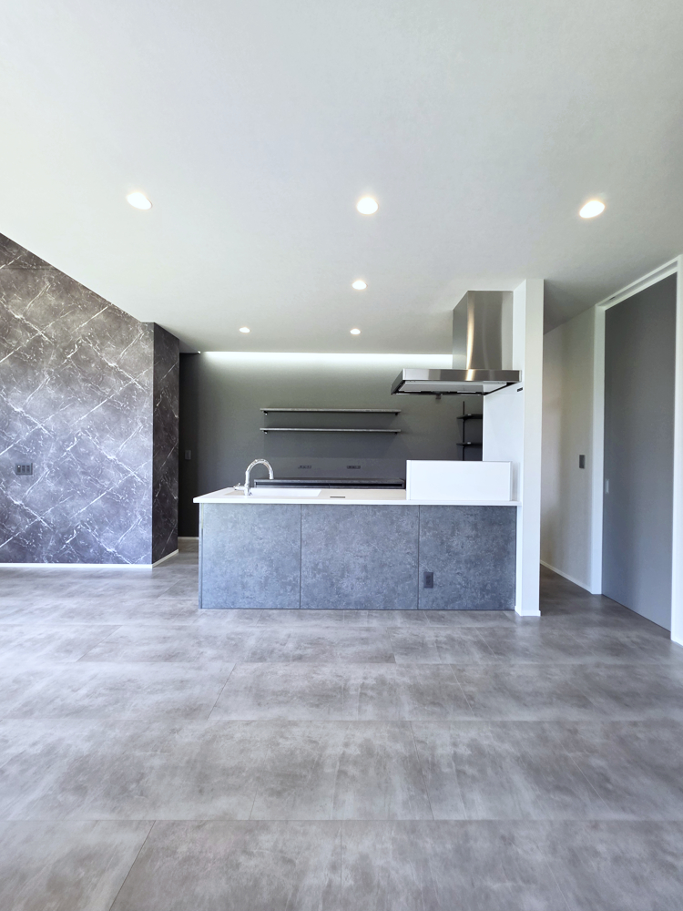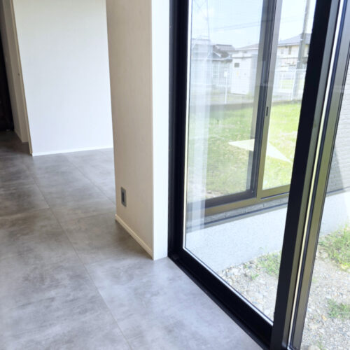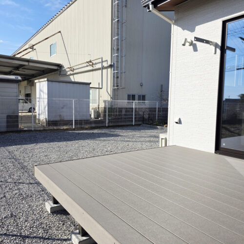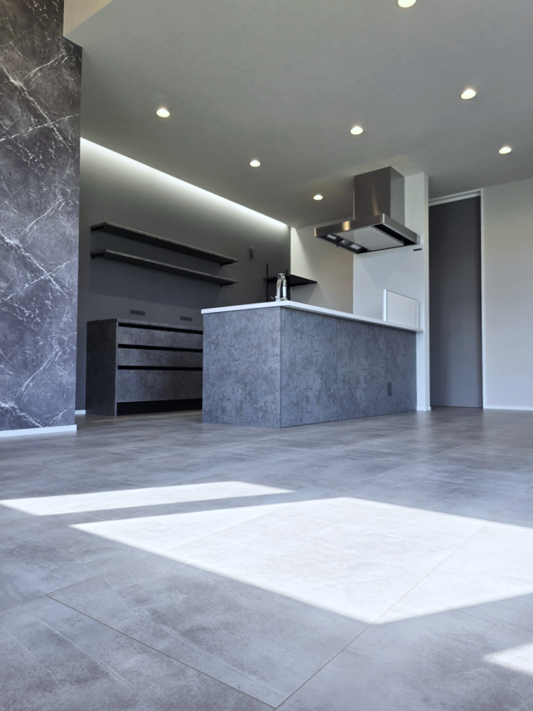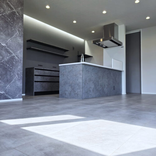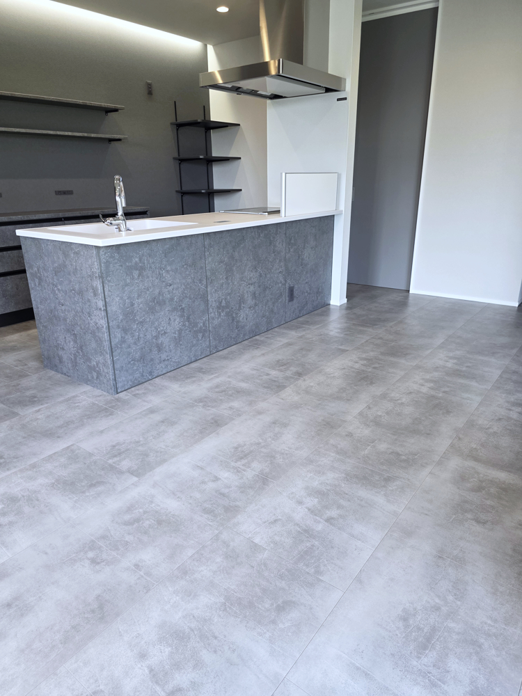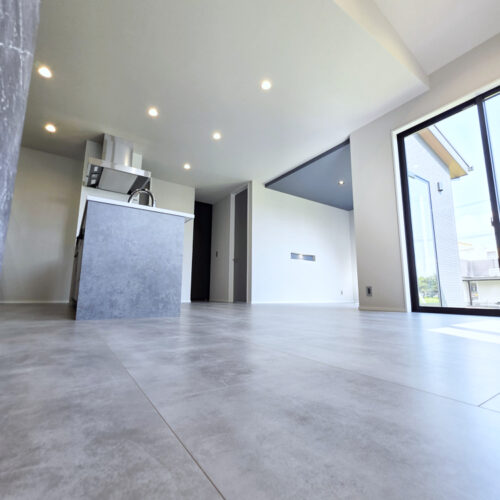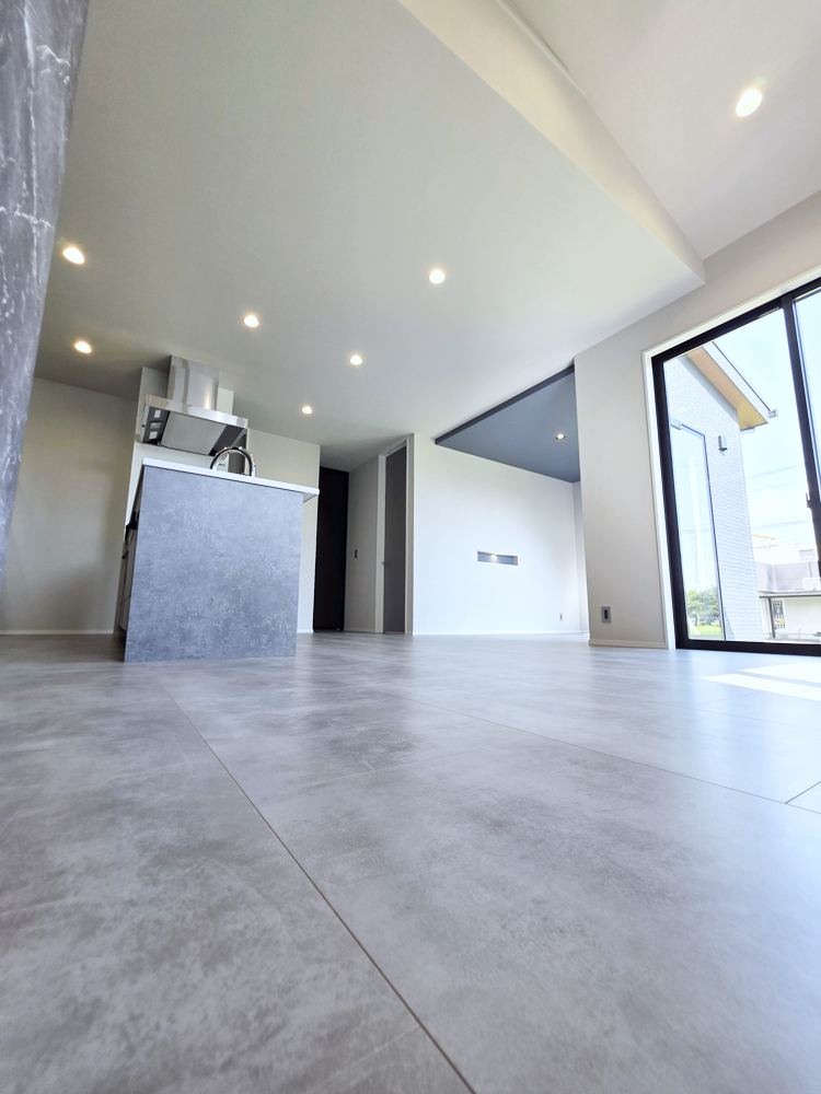木目のないモルタル調の床を使用!ニュートラルで落ち着いた印象のあるグレーは、万能色でありコーディネートもしやすく幅広い層に支持されています。また、家に合わせてグレーのウッドデッキを採用しているのも注目です。