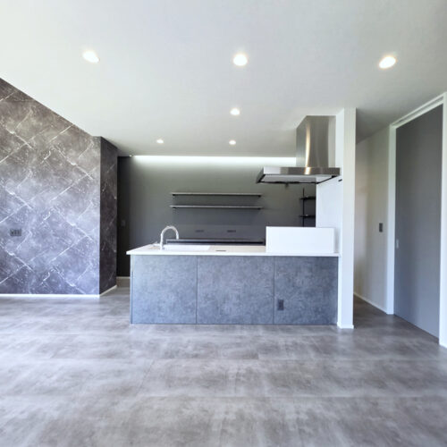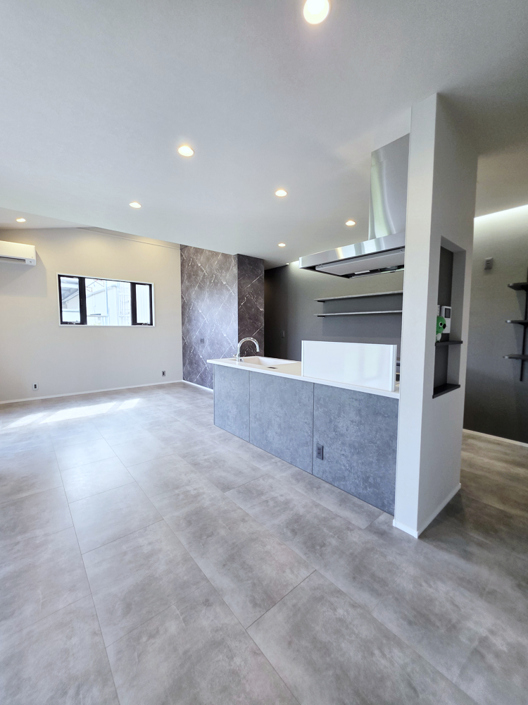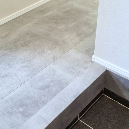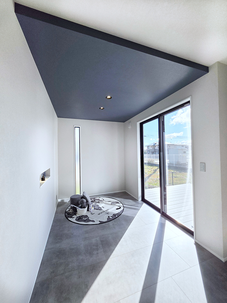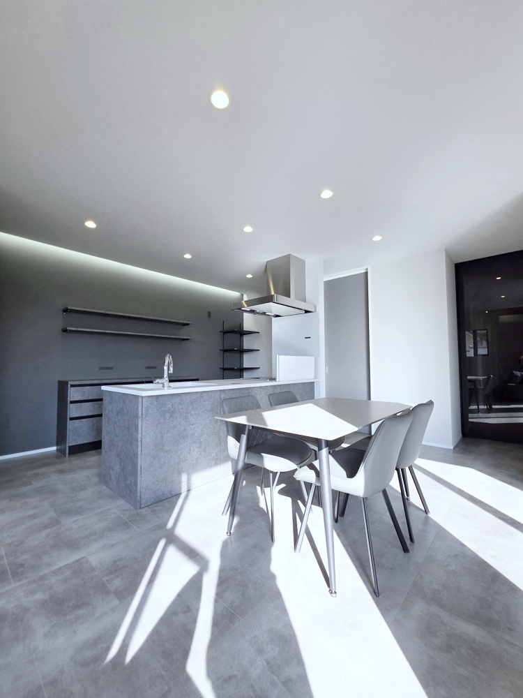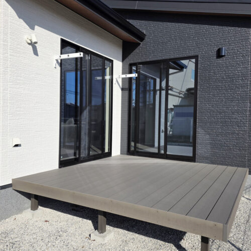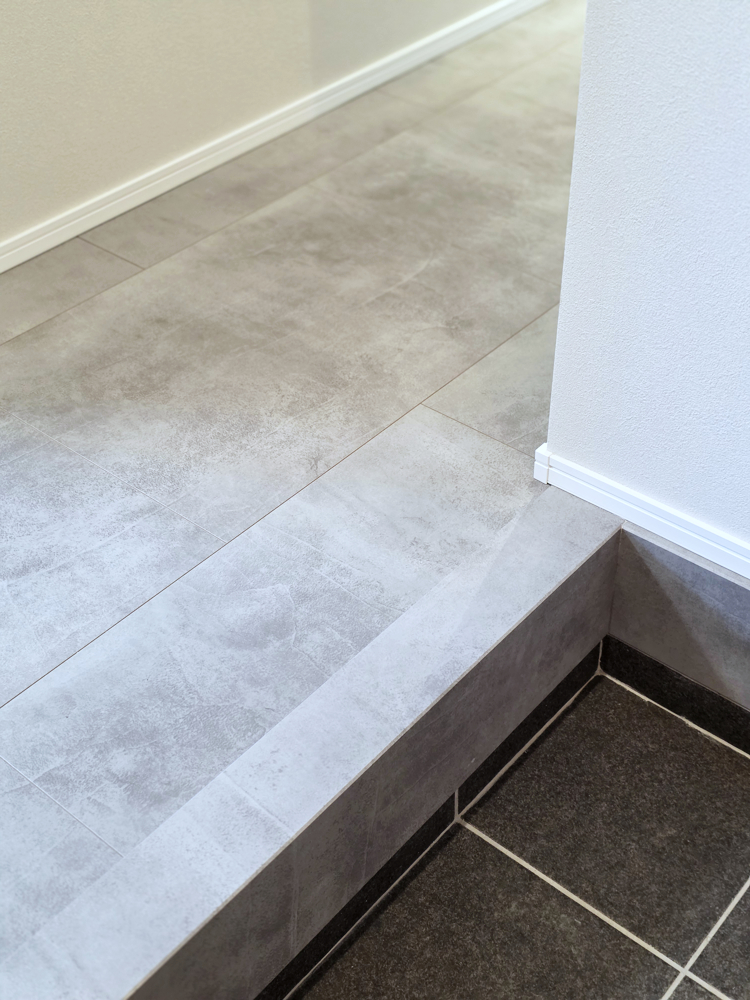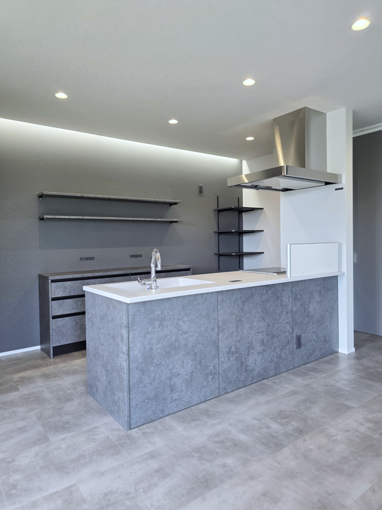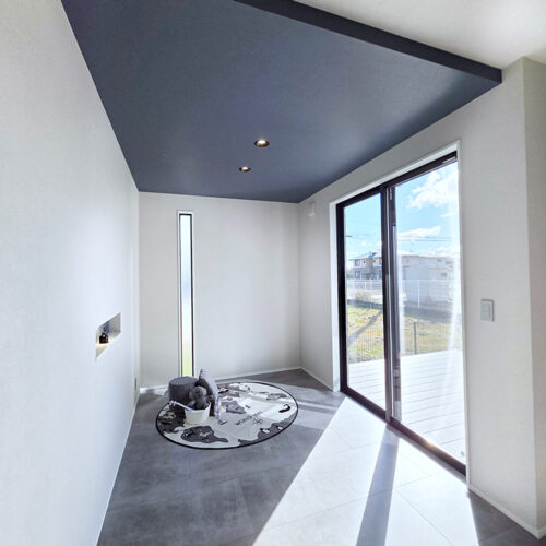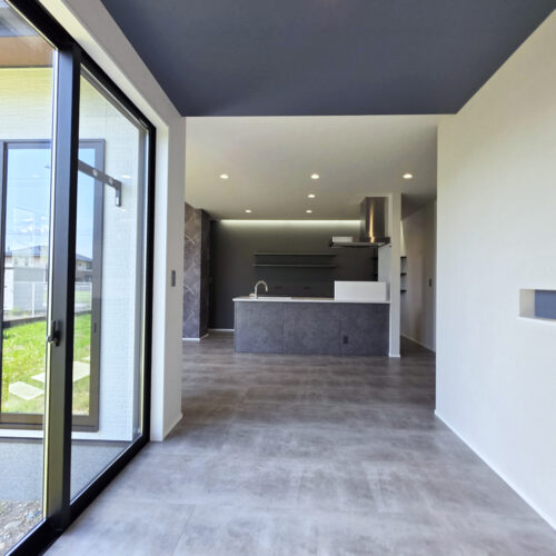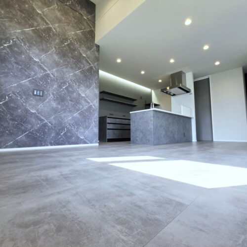 木目のないモルタル調の床を使用!ニュートラルで落ち着いた印象のあるグレーは、万能色でありコーディネートもしやすく幅広い層に支持されています。また、家に合わせてグレーのウッドデッキを採用しているのも注目です。