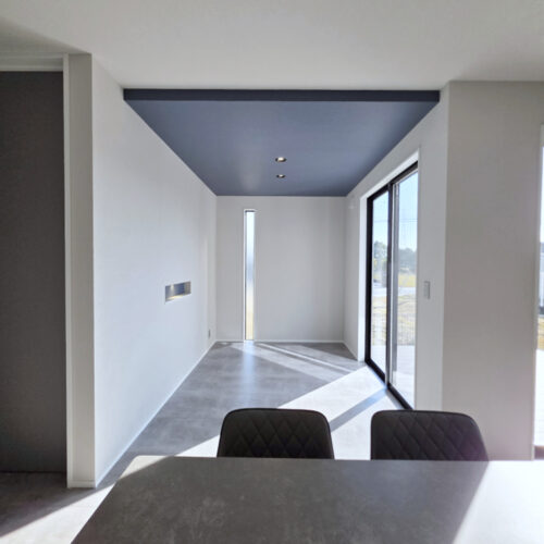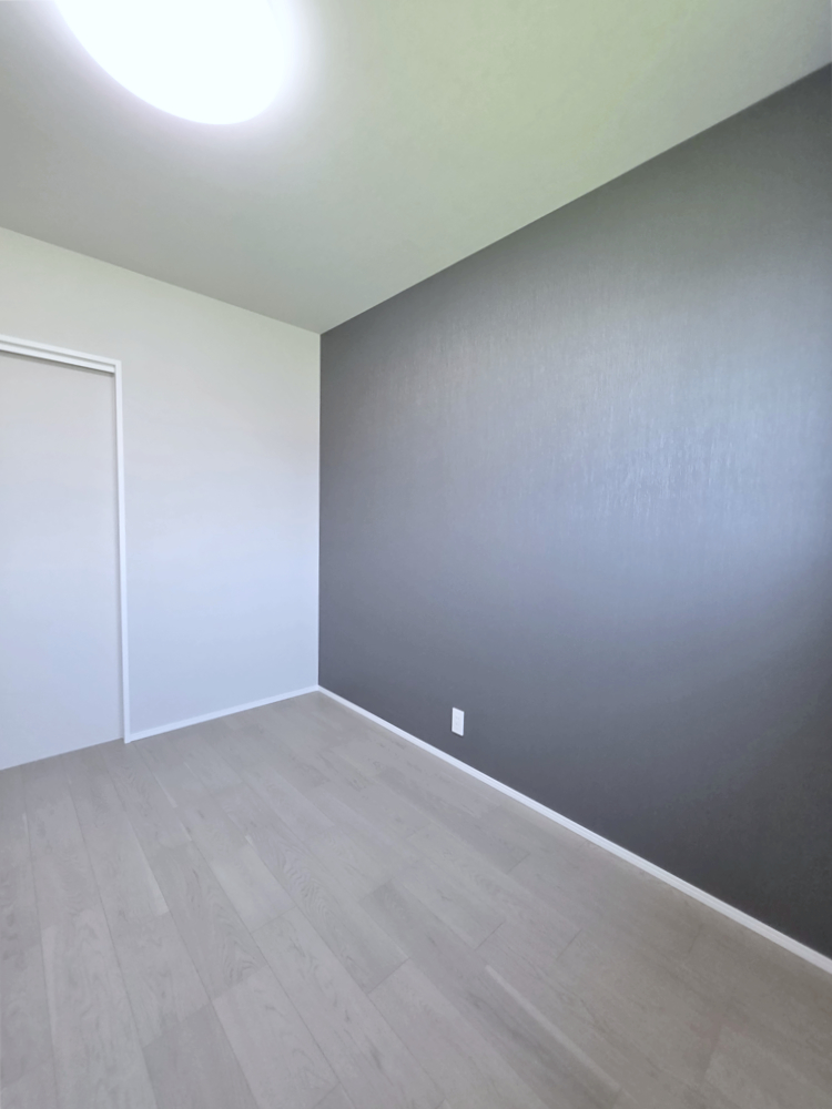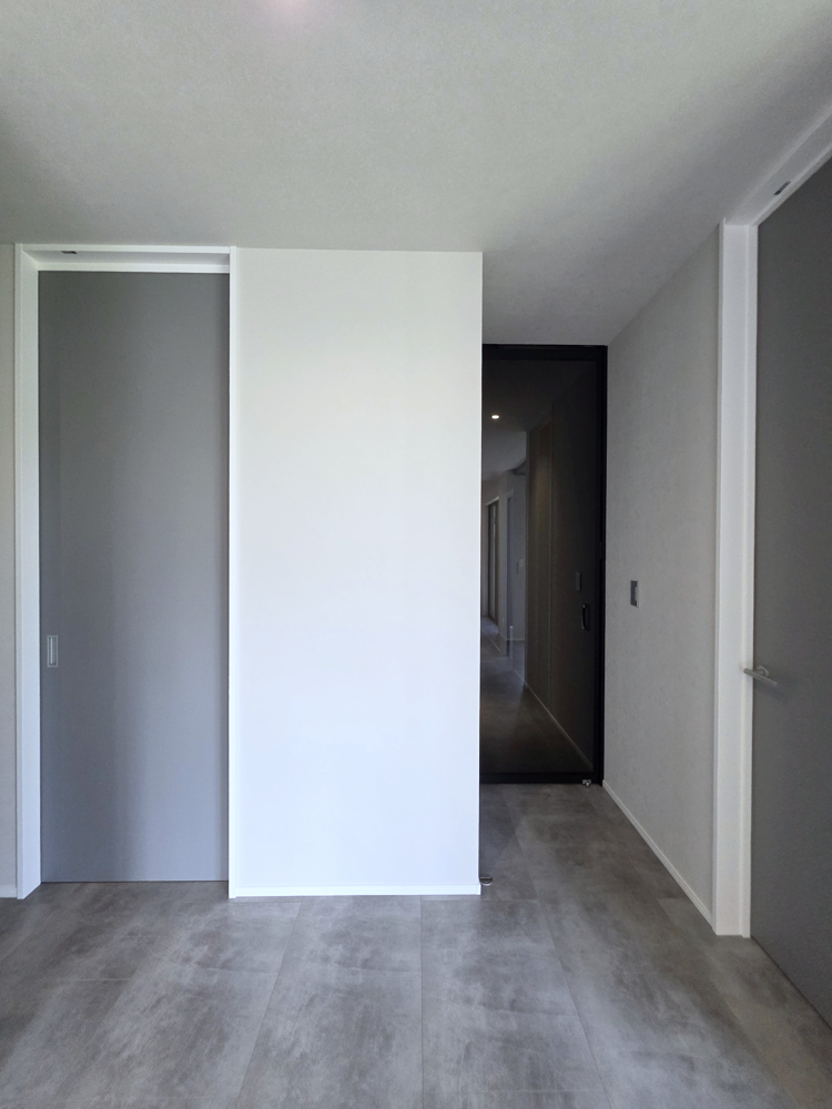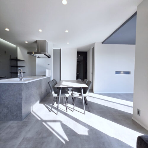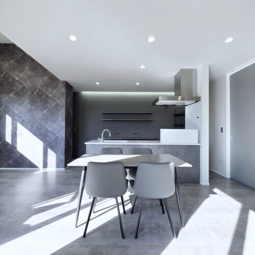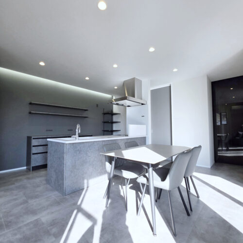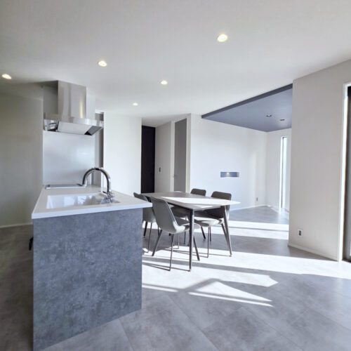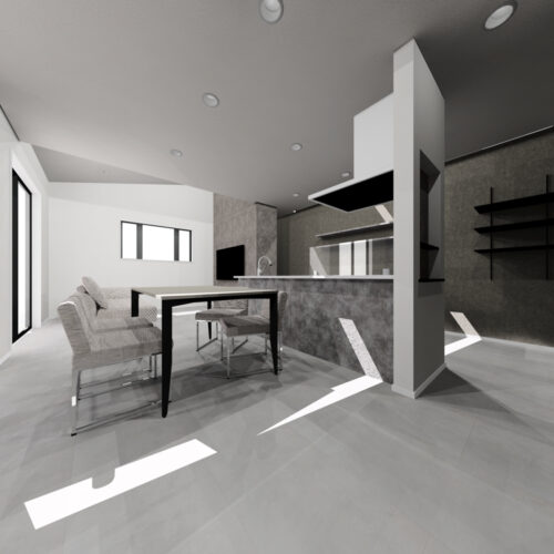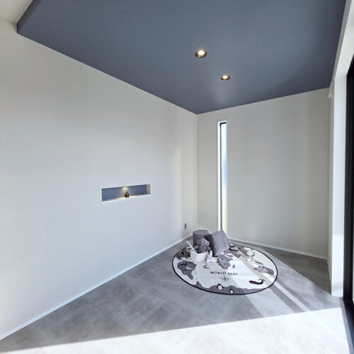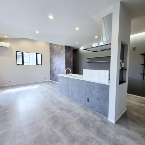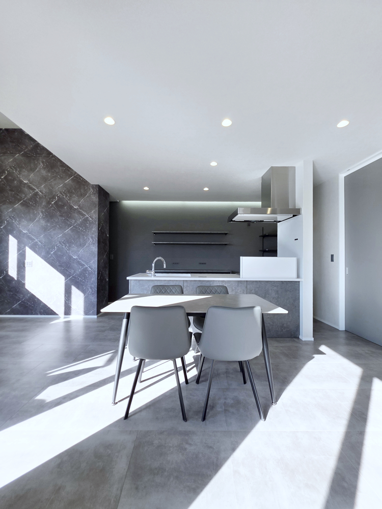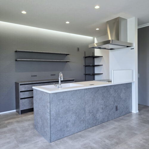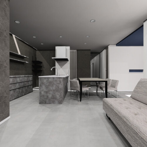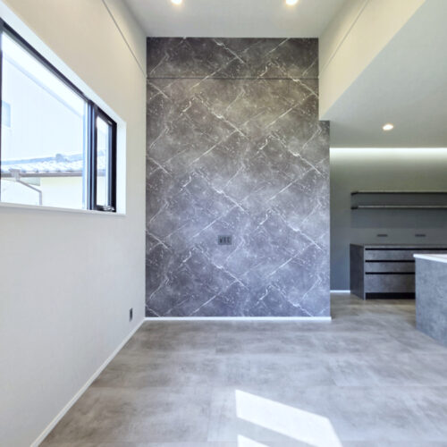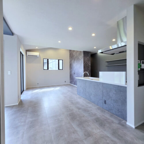 木目のないモルタル調の床を使用!ニュートラルで落ち着いた印象のあるグレーは、万能色でありコーディネートもしやすく幅広い層に支持されています。また、家に合わせてグレーのウッドデッキを採用しているのも注目です。