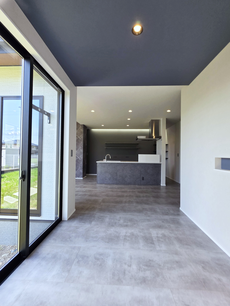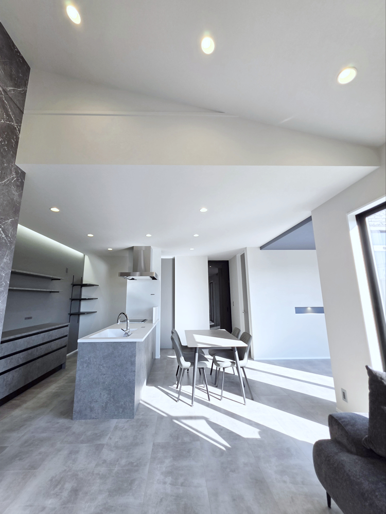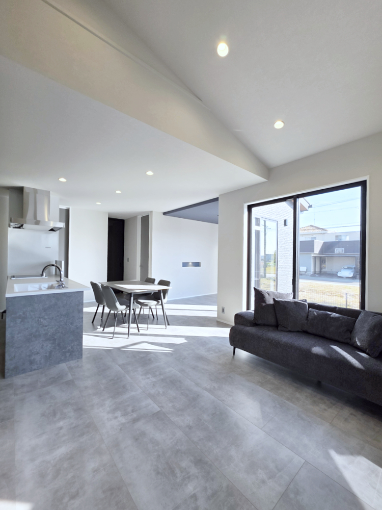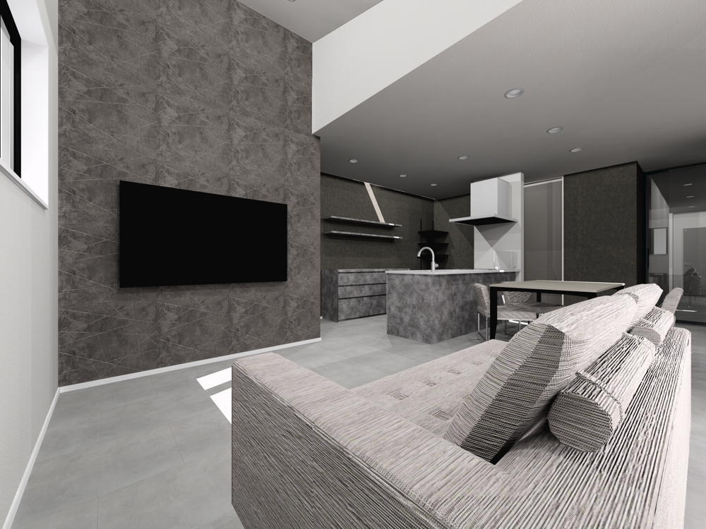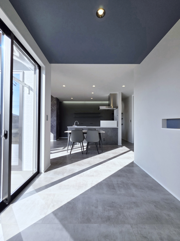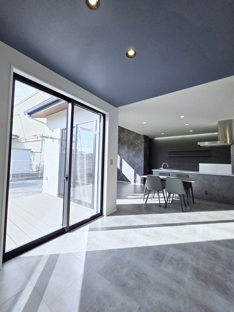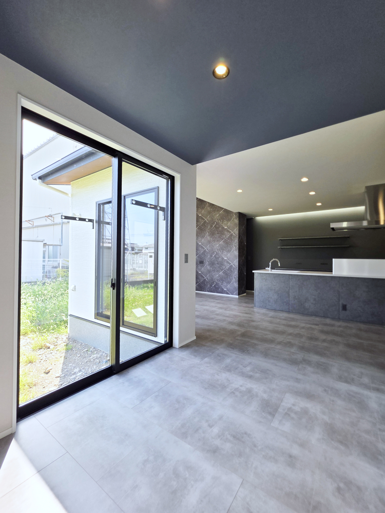 掃き出し窓を背にしたソファ側から広がる勾配天井は開放感があります。ホールとリビングをつなぐブラックガラスファミットのかっこよさや、各所の照明インテリアも注目です!