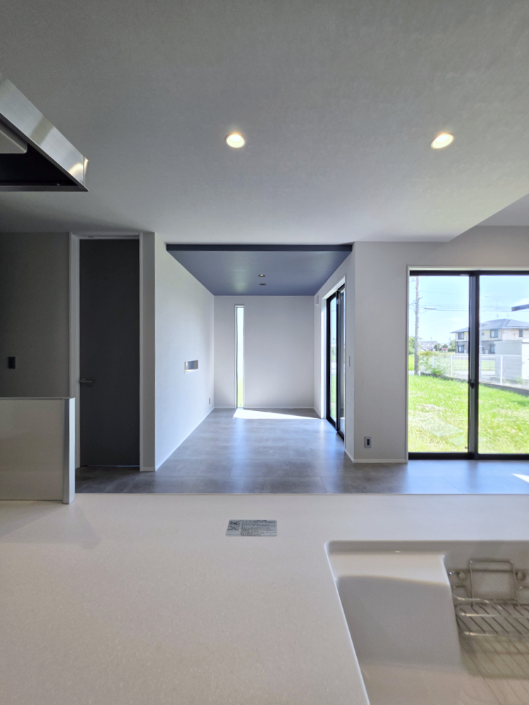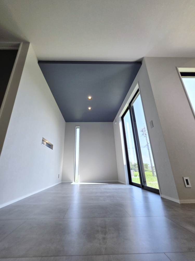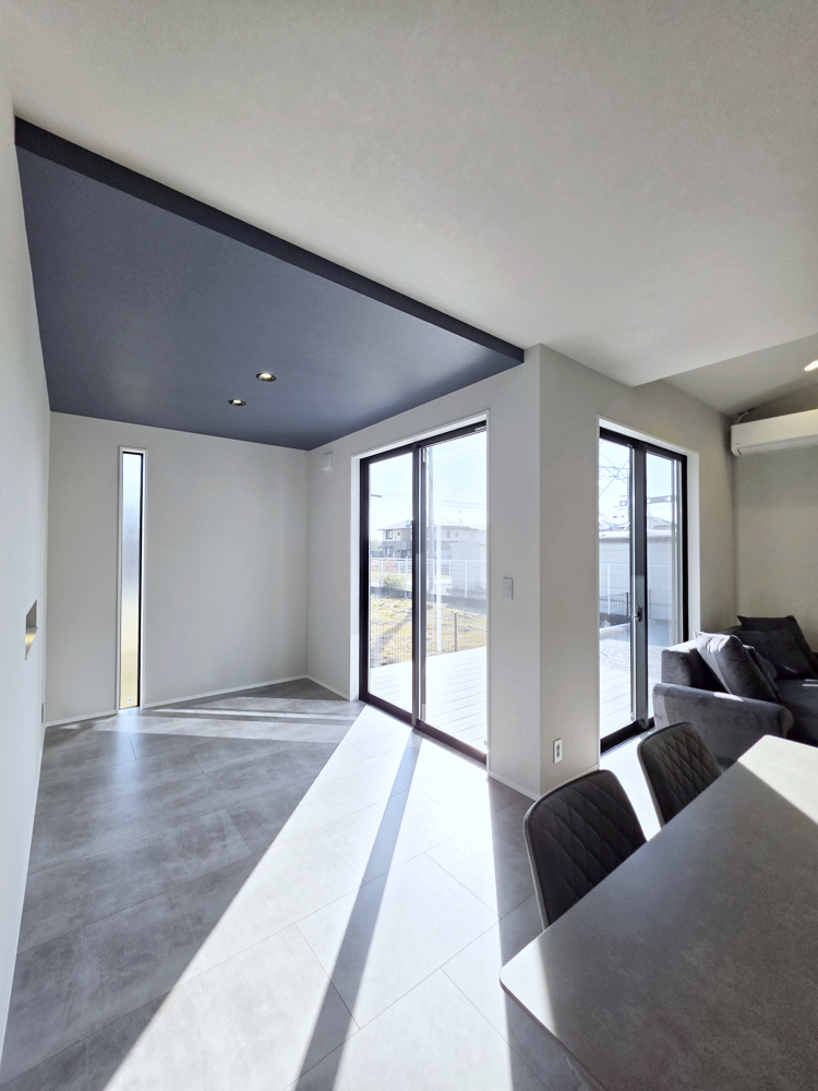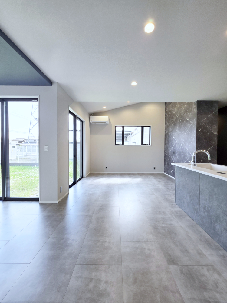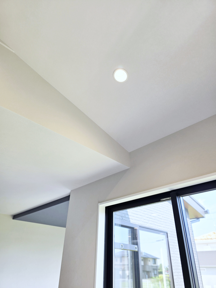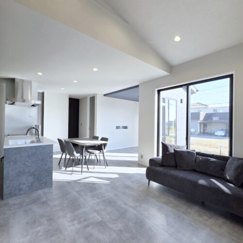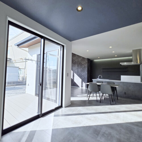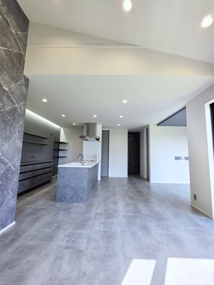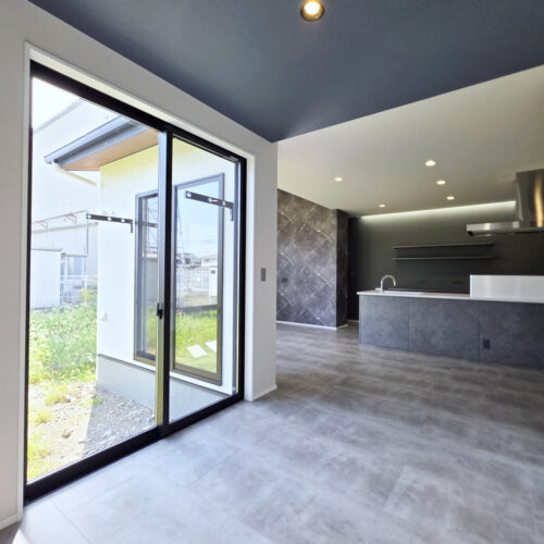 掃き出し窓を背にしたソファ側から広がる勾配天井は開放感があります。ホールとリビングをつなぐブラックガラスファミットのかっこよさや、各所の照明インテリアも注目です!