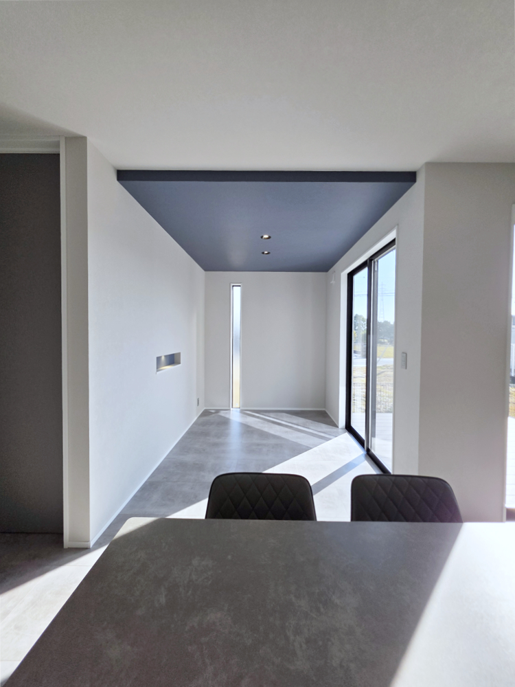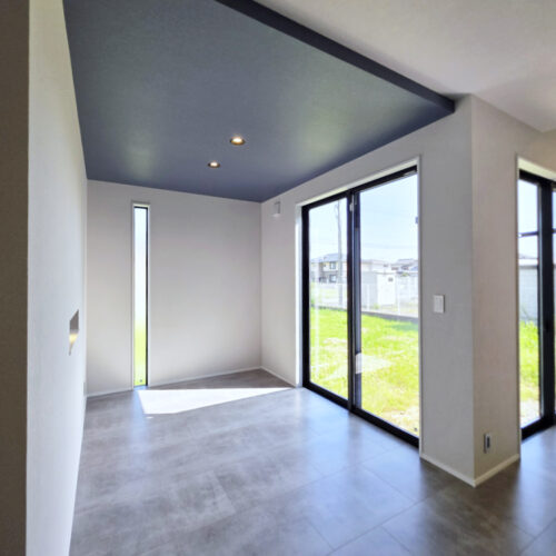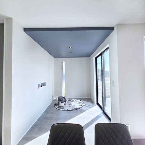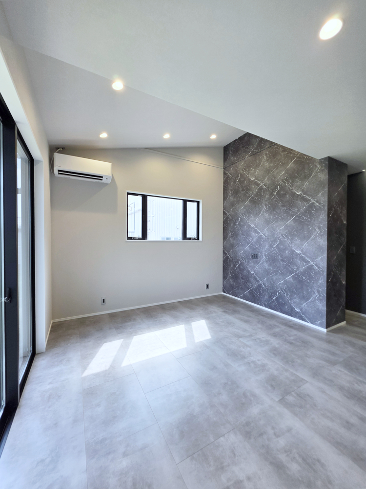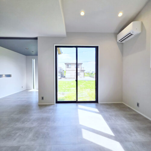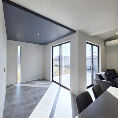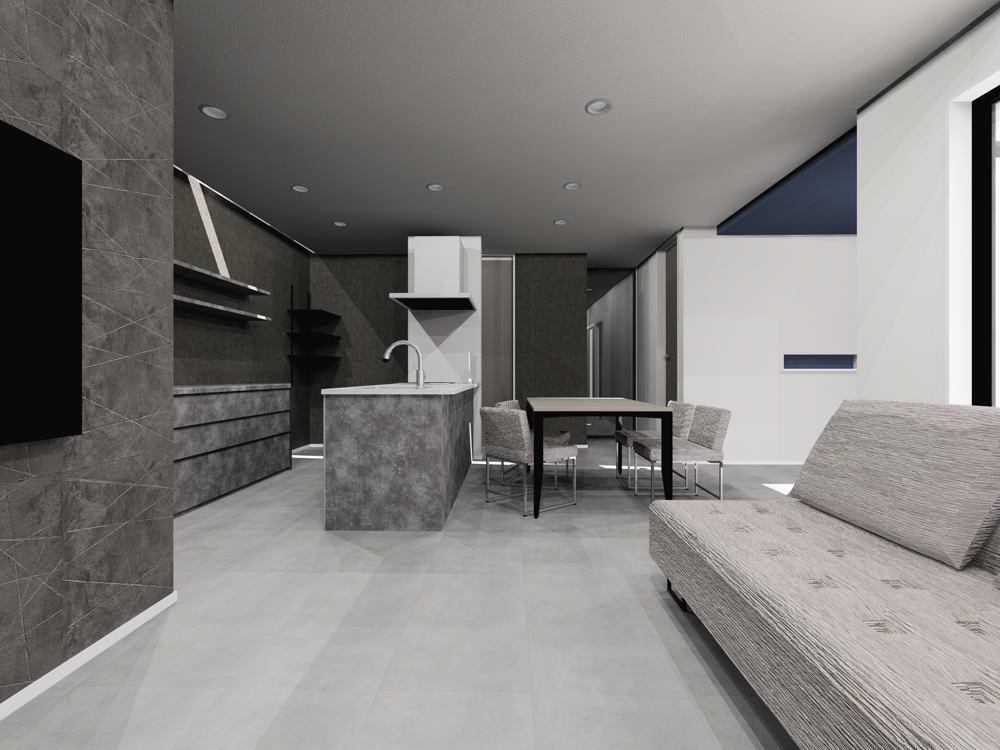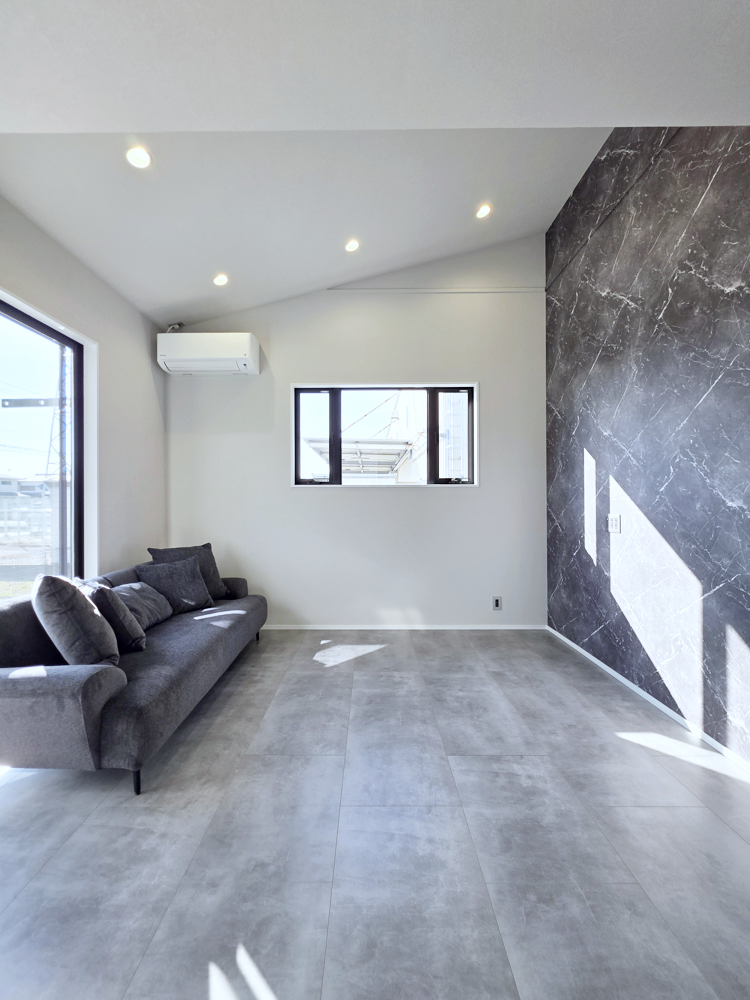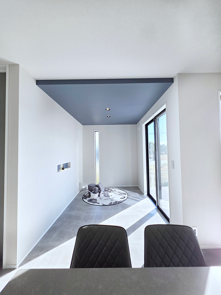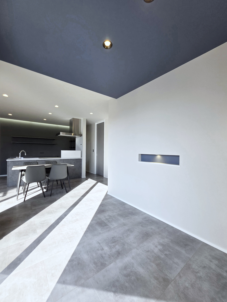 掃き出し窓を背にしたソファ側から広がる勾配天井は開放感があります。ホールとリビングをつなぐブラックガラスファミットのかっこよさや、各所の照明インテリアも注目です!
