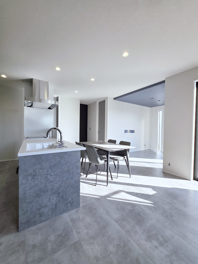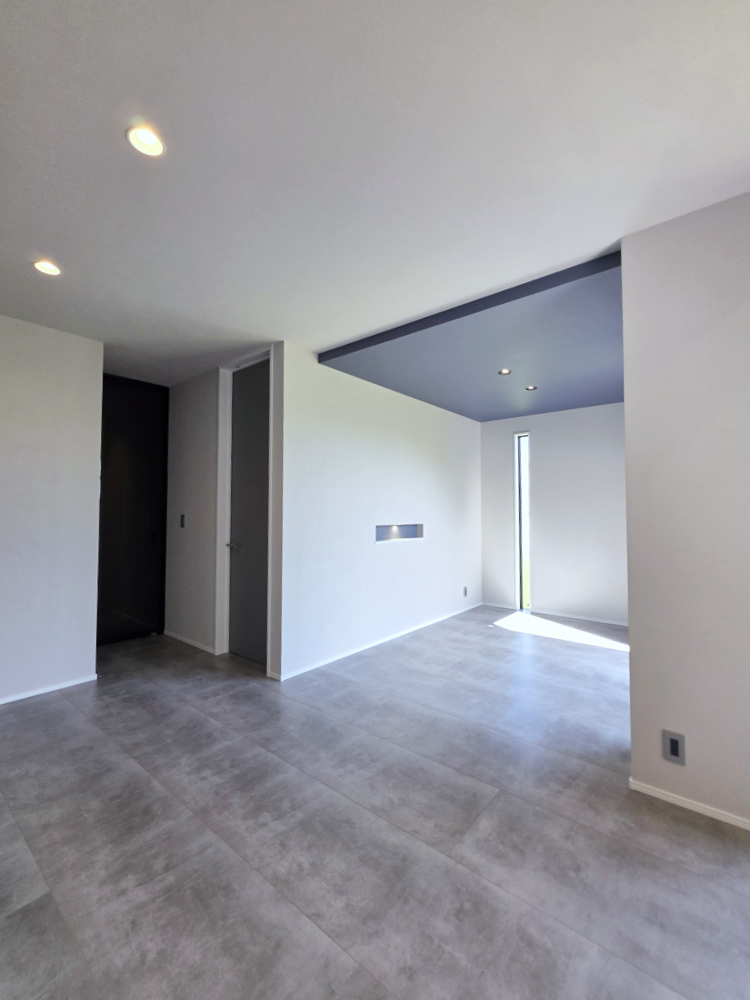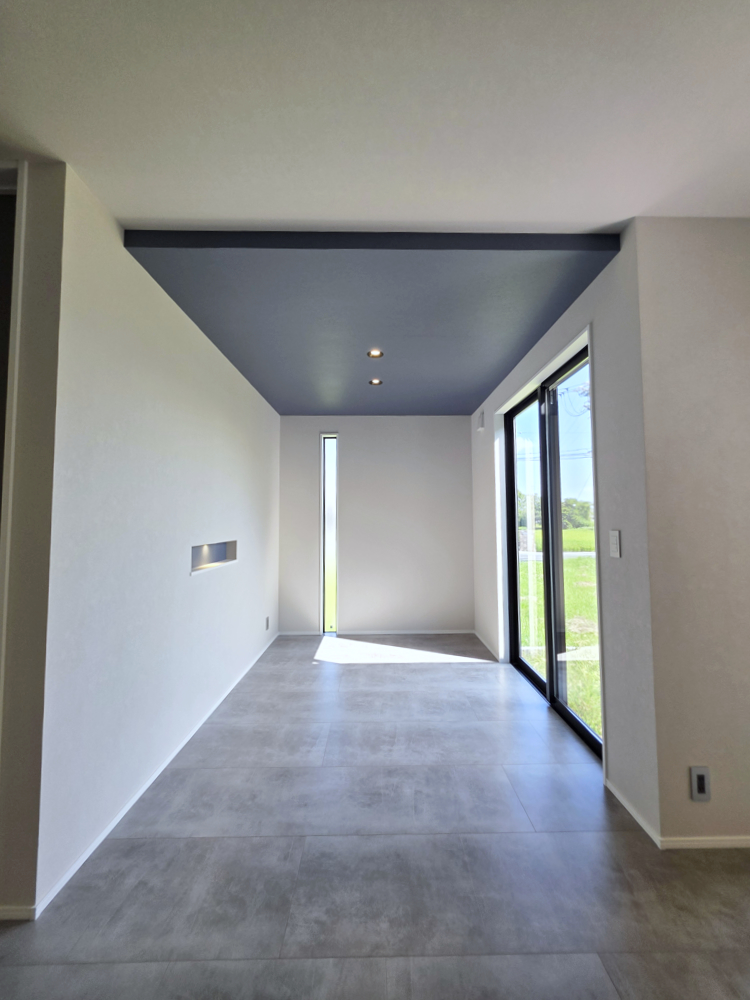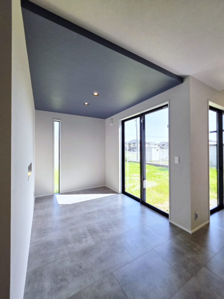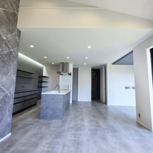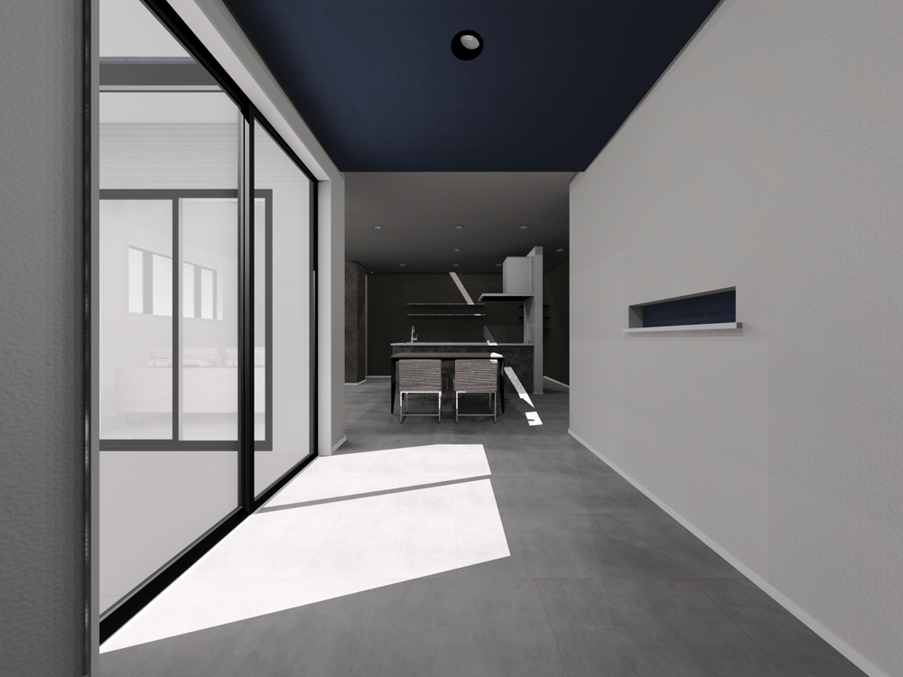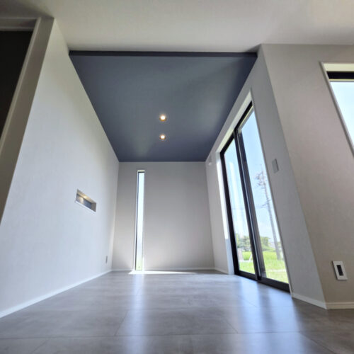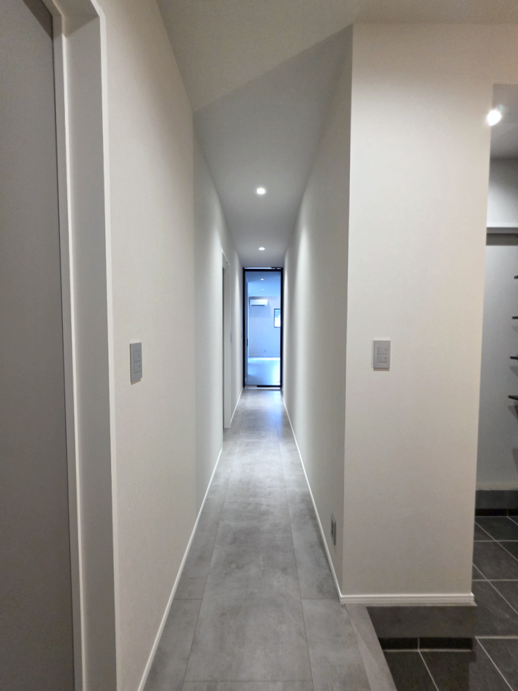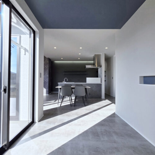 掃き出し窓を背にしたソファ側から広がる勾配天井は開放感があります。ホールとリビングをつなぐブラックガラスファミットのかっこよさや、各所の照明インテリアも注目です!